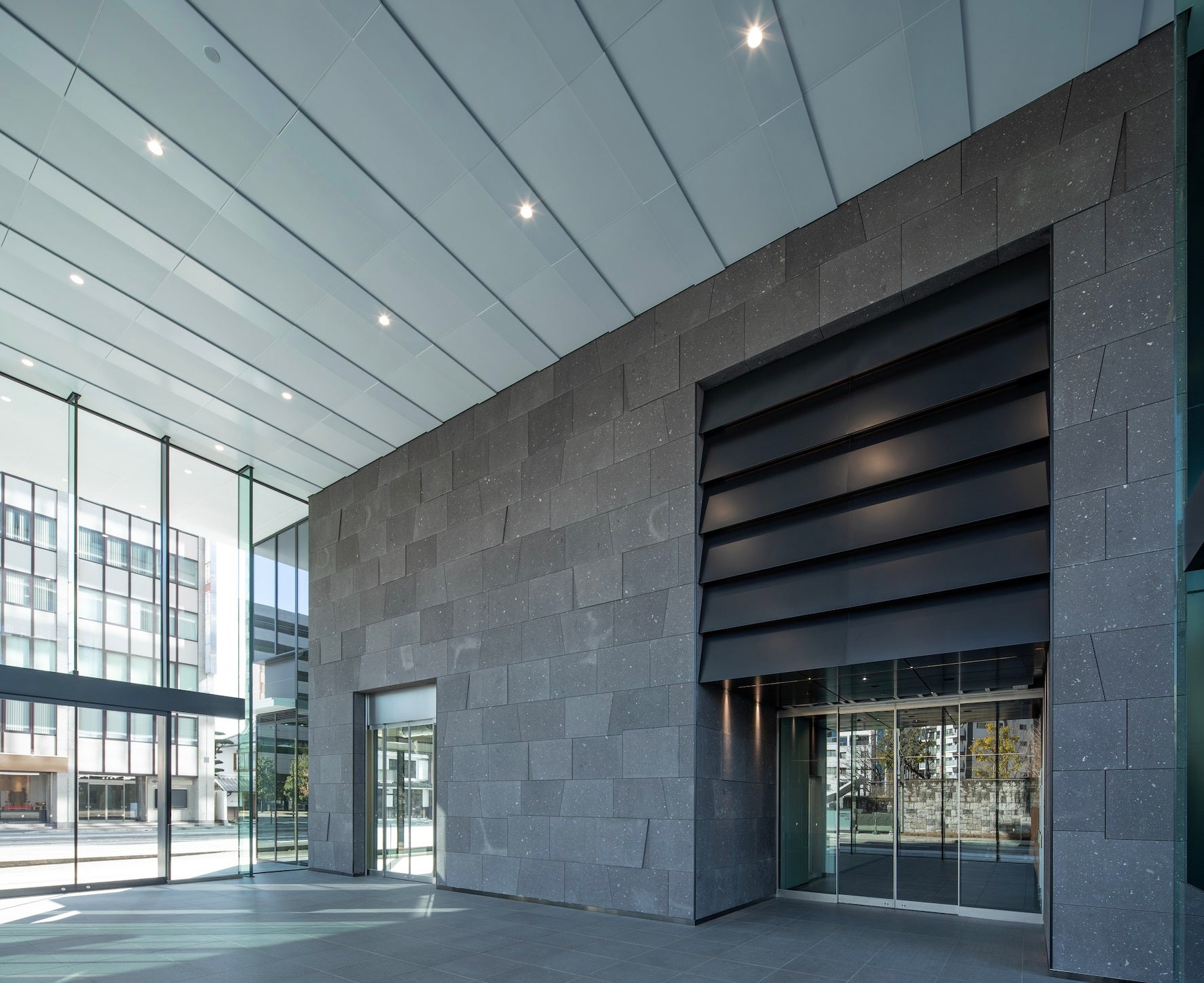 壁面に肥後石を使用した「日本生命熊本ビル」のエントランス