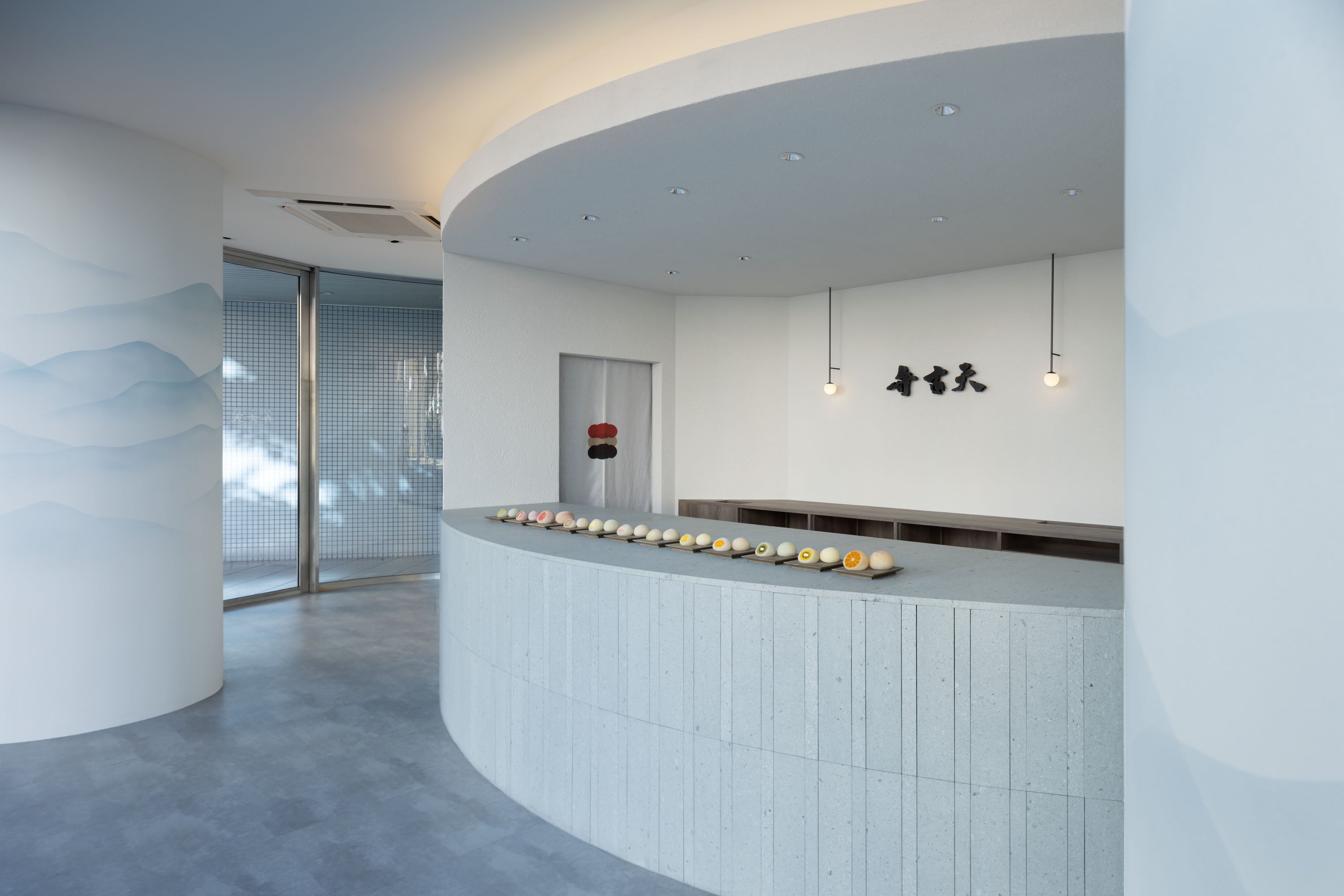 青竜山石を貼った「覚王山フルーツ大福 弁財天 堂島店」のカウンター