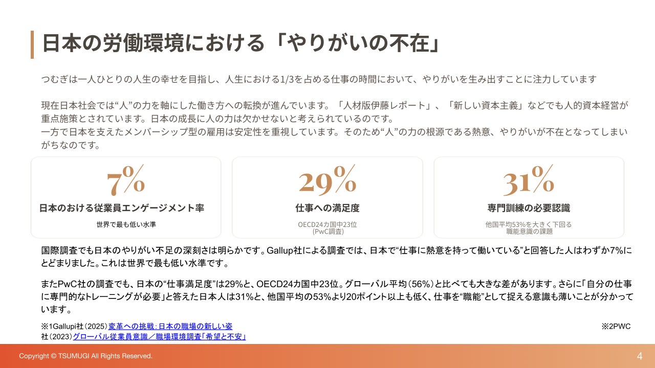 働くにおけるやりがい向上という面においては、仕事は人生の約1/3を占めるにもかかわらず、日本では「働くことが楽しい」「意味がある」と感じにくい状況があります。