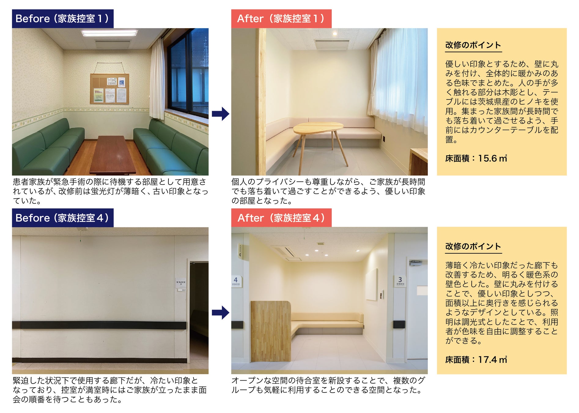 茨城県南地域の三次救急医療を担う、当院の救命救急センターは、年間6,300件を超える救急搬送のほか、ドクターカーの運用、救急ヘリコプター搬送による重症患者受け入れを行っています。今回改修したICU家族控室は、重症度の高い患者や病棟で急変した患者の家族が、処置が終了するまでの間に待機する場所で、一日あたり最大10組が利用し、長い時は8時間近く滞在する場合もあります。また、当院のICUは開院当初からある棟に位置しているため、老朽化に加え、「狭く圧迫感がある」などの職員からの声もあり、療養環境改善が長年の課題となっていました。