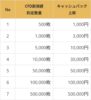 - キャンペーン期間中のCFD取引の新規建て約定枚数に応じて、キャンペーン期間中にお支払いいただいた他商品の取引手数料や信用取引金利・貸株料の一部をキャッシュバックいたします。