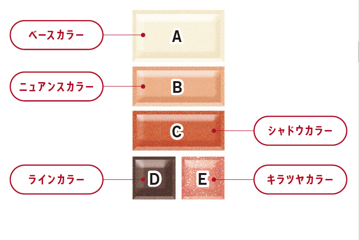 肌なじみがよく、くすみのないブラウンベース4色(A~D)のグラデーションで自然に大きく、深みのある甘い目もとに。