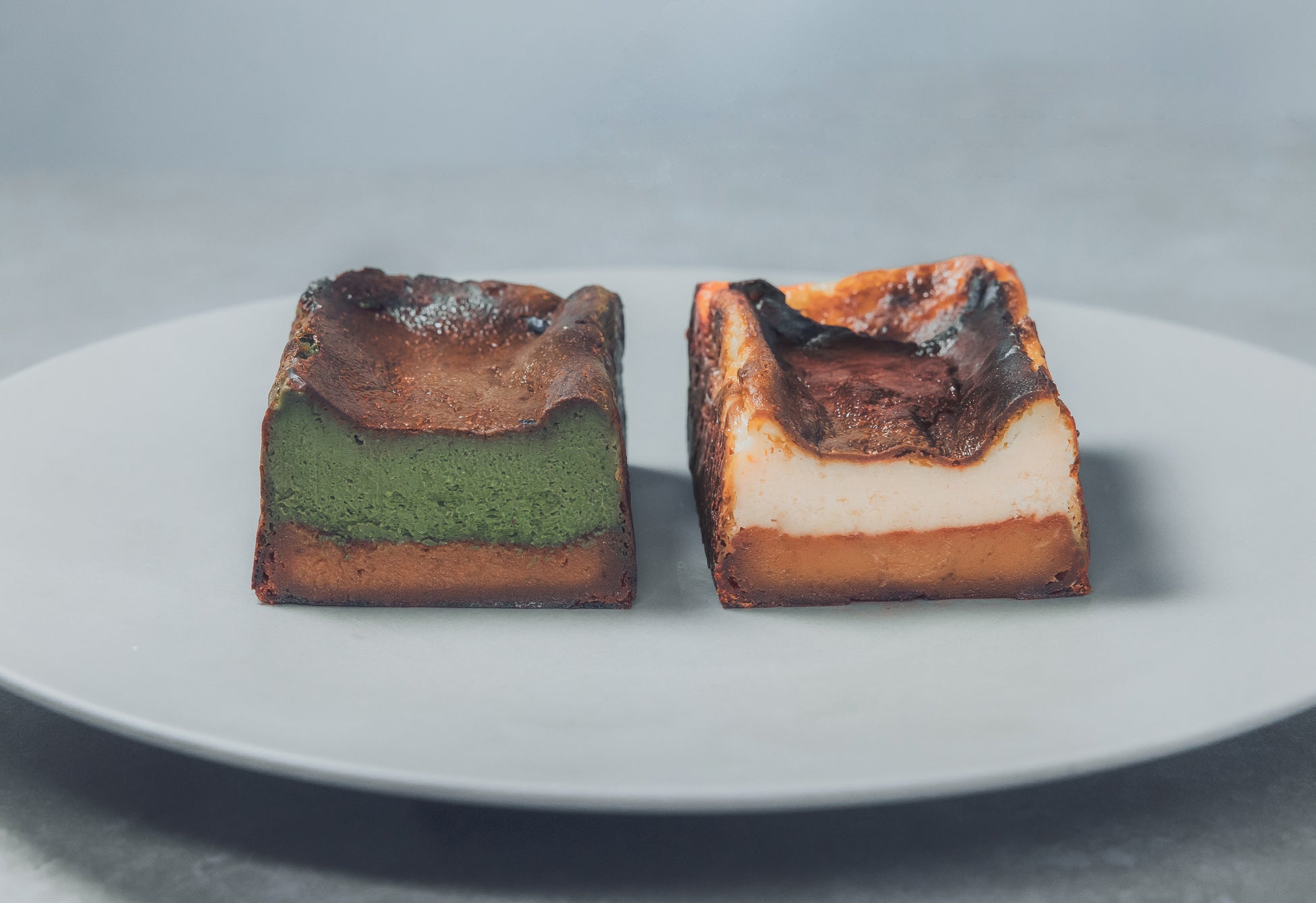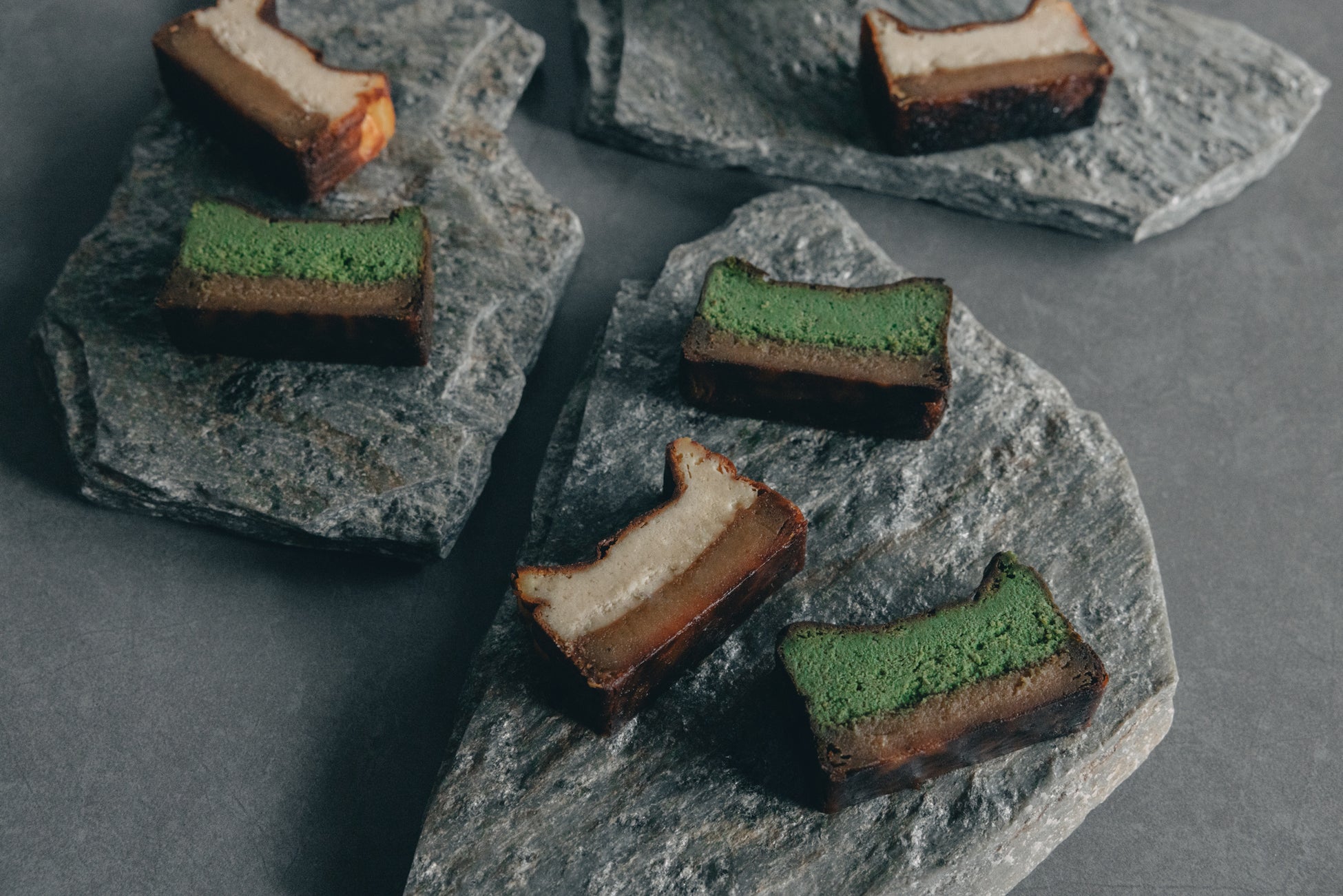 素材の味を生かした上品な甘さに高温でじっくり焼き上げることでしみ出した蜜が焦げて香ばしいカラメルのようなほろ苦さも味わえる蜜芋バスクチーズケーキに、上品ながらも力強く雑味のない味わいが魅力の宇治抹茶を加えることでチーズの爽やかな風味を崩すことなくバランスのとれた奥深い味わいを実現しています。