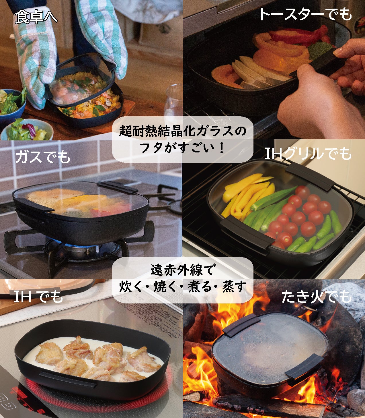 - フタには超耐熱結晶化ガラスを使用。調理中に「中が見える」という付加価値をプラス。