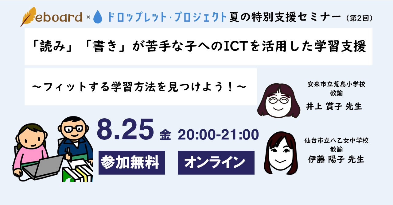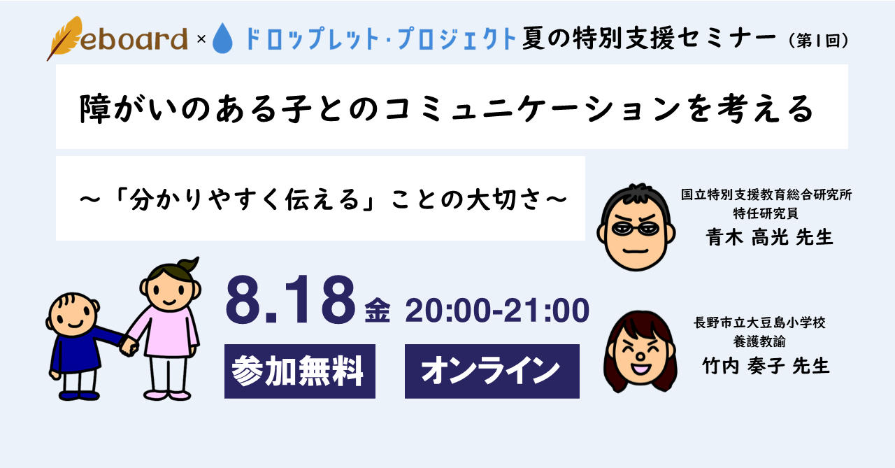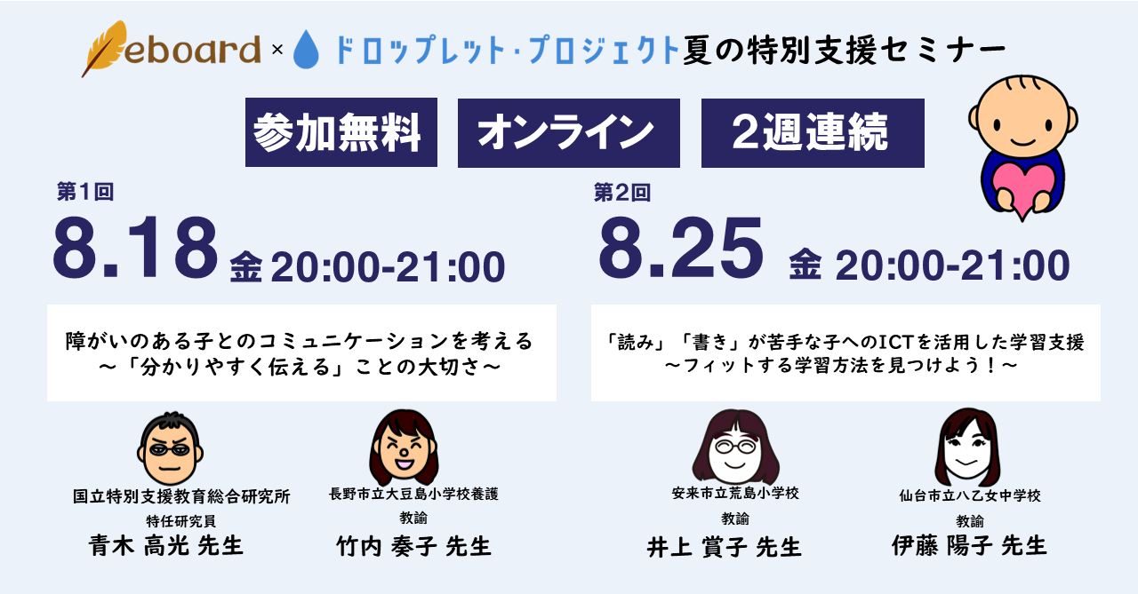 以下のとおり、eboard×ドロップレットプロジェクト 夏の特別支援セミナーを開催します。