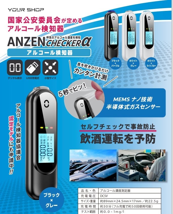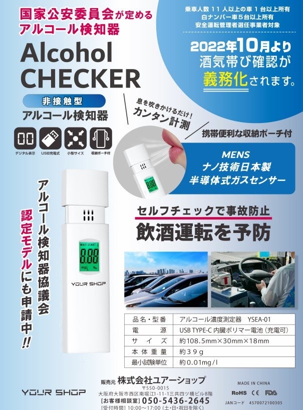アルコール検知器協議会正会員株式会社ユアーショップ(兵庫県尼崎市西長洲町1-3-20、代表取締役CEO:西村直也)は道路交通法の改正により2023年12月から対象事業者での検知器によるアルコールチェックが義務化されることに先立ち、手軽に呼気のアルコール濃度をチェックすることができるアルコール検知器「ANZEN CHECKER(アンゼンチェッカー)」「Alcohol CHECKER YSEA-01(アルコールチェッカーYSEA-01)」「ANZEN CHECKER α アンゼンチェッカーアルファ」と検査結果をすぐにプリント可能なプリンター付きアルコール検知器「Alcohol CHECKER(アルコールチェッカー)」の4商品を販売中。