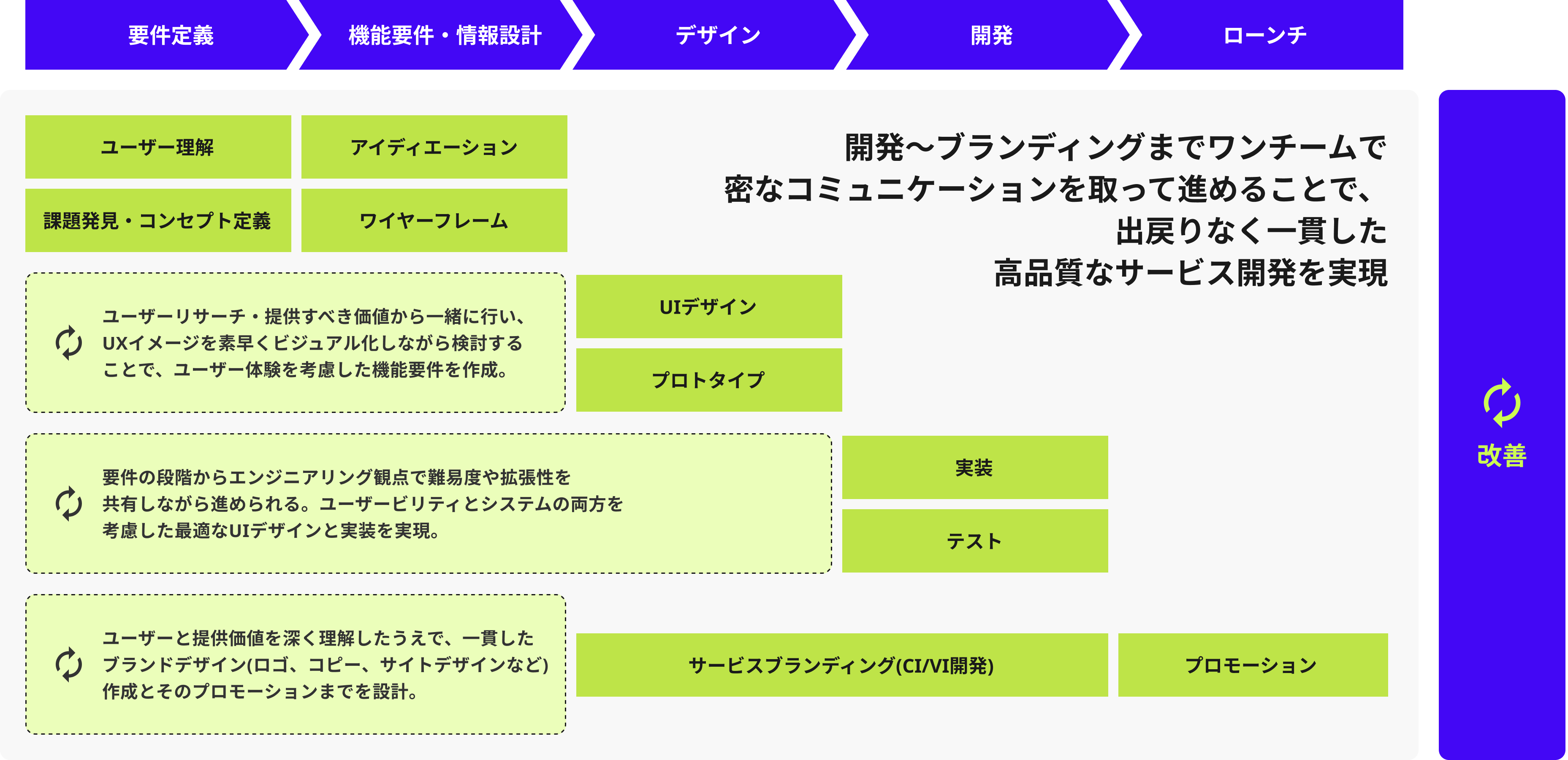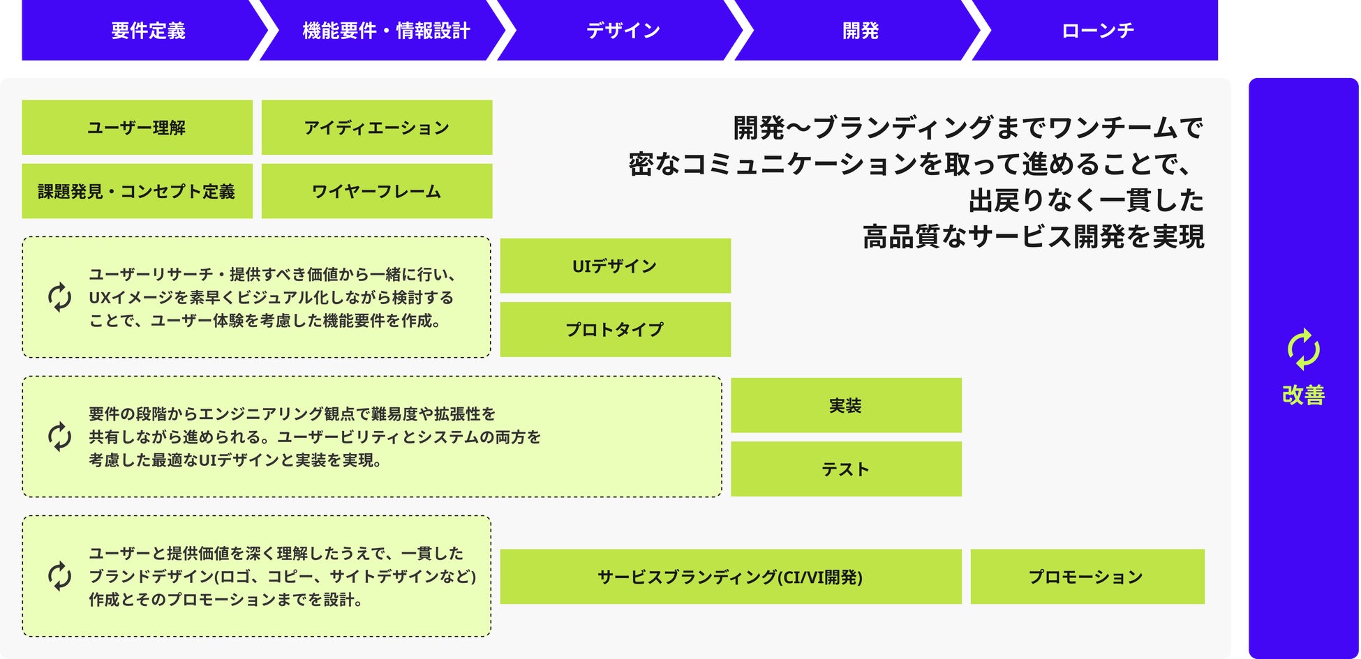 このサービスを利用していただくことで、お客様と伴走する形でユーザーに最適な機能要件を考え、プロトタイピング検証やエンジニアリング観点での難易度や拡張性を早い段階で共有しながら進められるため、出戻りなく一貫して高品質なサービス開発が可能になります。さらに、ブランドデザイン・プロモーションも提供価値を深く理解した上で統一感を持ち、設計いたします。