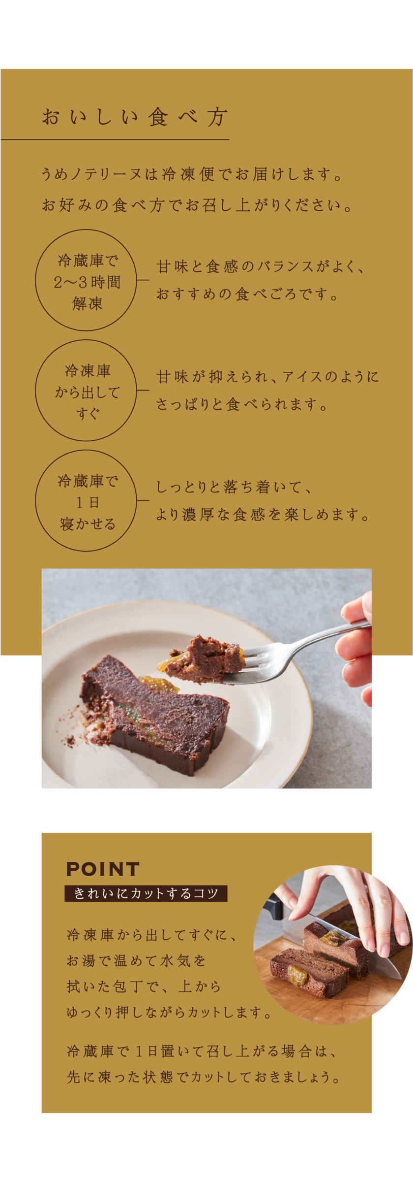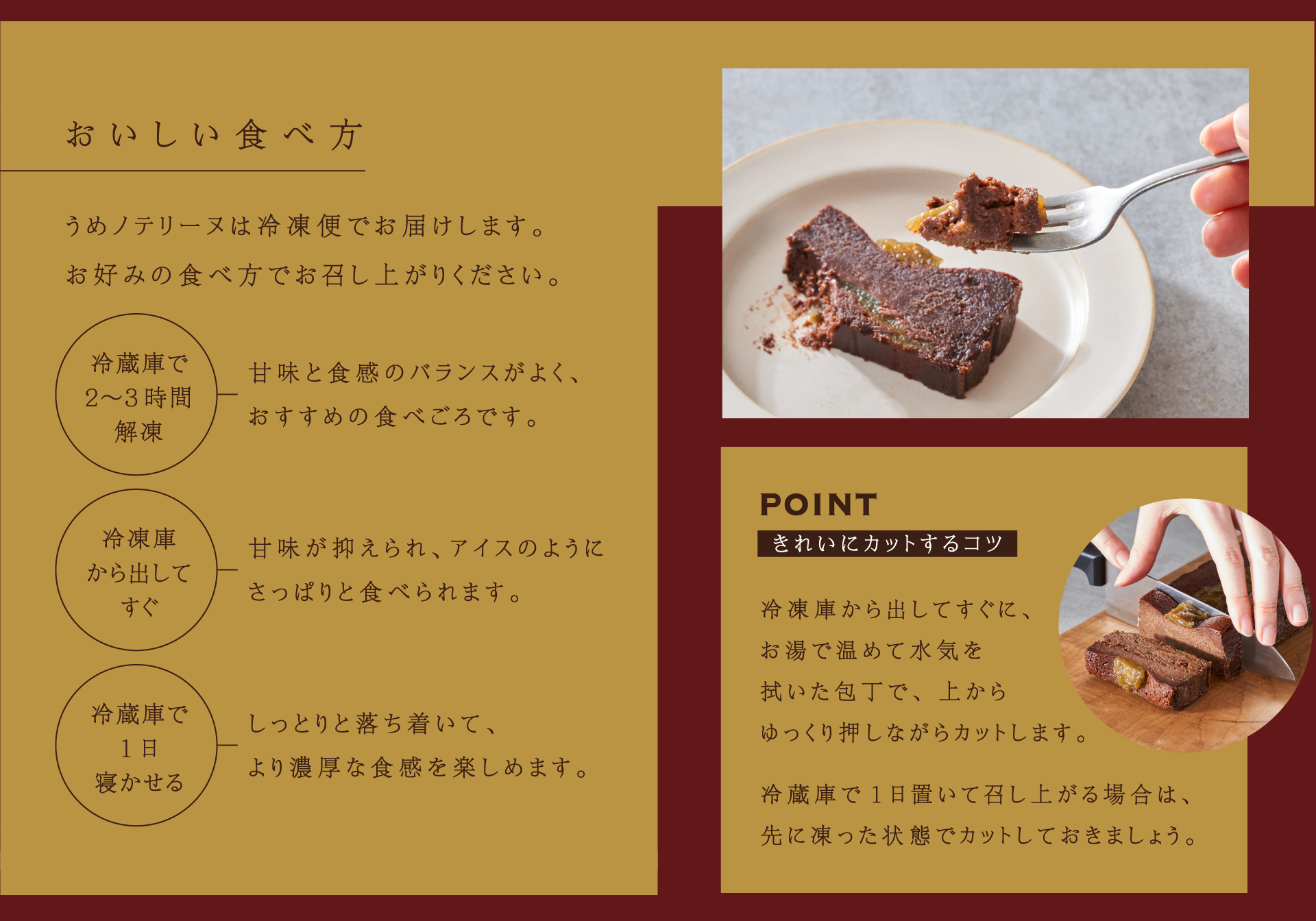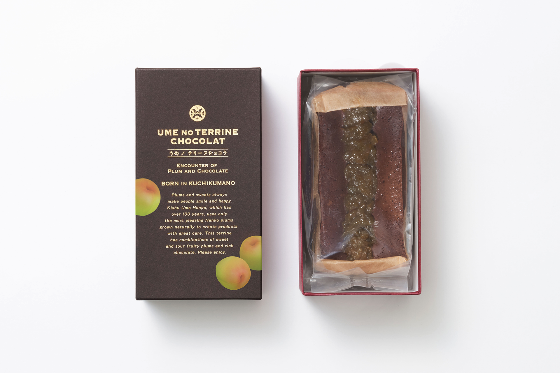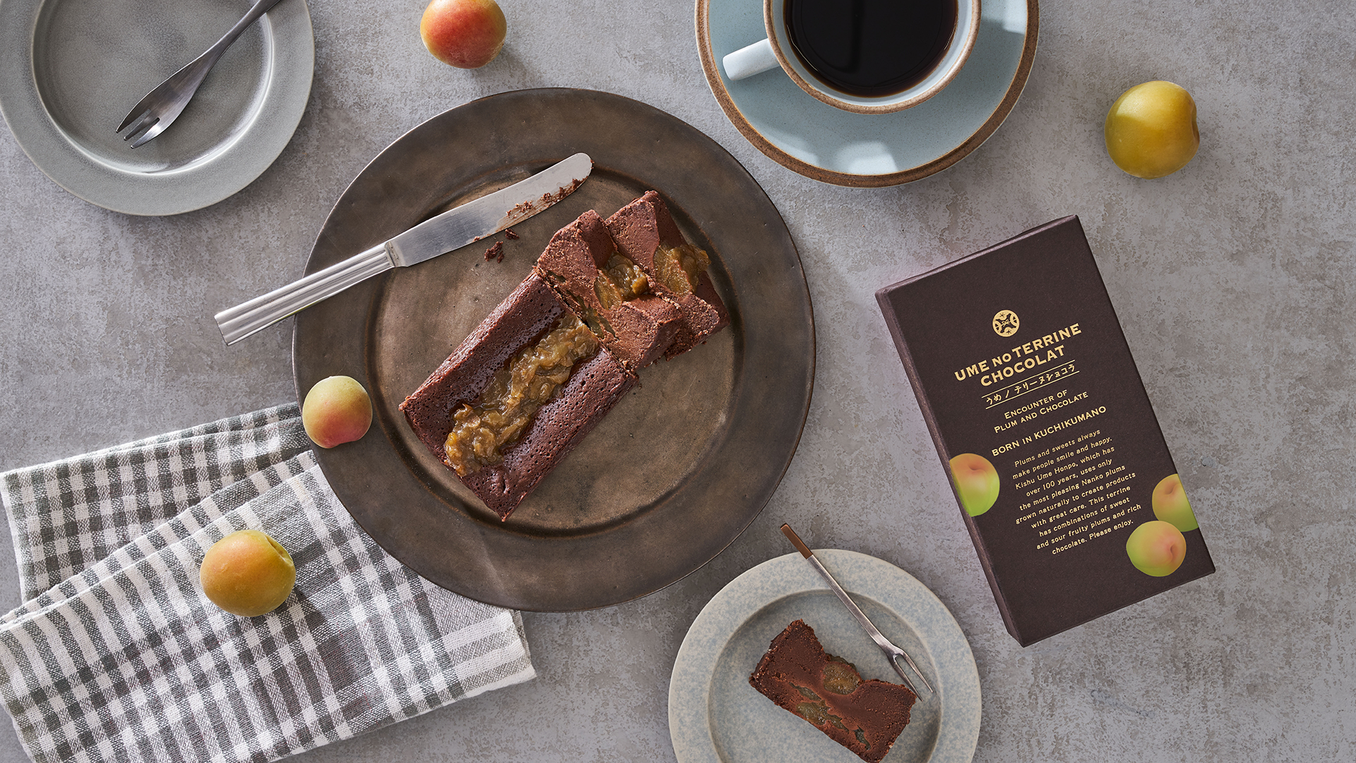 「うめノ テリーヌショコラ」は「梅の美味しさをもっと多くの人に届けたい!」という想いから、スイーツ作りが始まりました。数十を超える試作品の中で、職人がひとつひとつ丁寧に漬け込んだ芳醇な紀州南高梅をチョコレートテリーヌにふんだんに使用し「爽やかな香りとほろ苦い甘味」を愉しむことができる「うめノ テリーヌショコラ」が完成しました。しっとりとしたチョコレートテリーヌに、肉厚な梅の食感、香りと苦味のマリアージュ、最後にほのかにコーヒーの香りをまとわせることで、大人のスイーツに仕上げました。バレンタインにぴったりなこの商品を、ぜひお楽しみください。