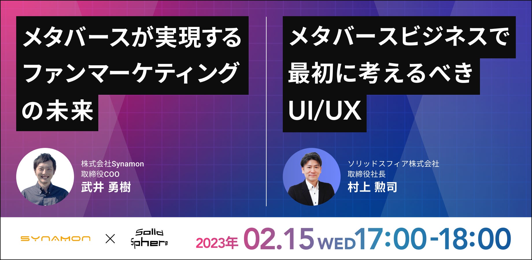 【2/15(水)17時から開催】「メタバース」をテーマにオンラインセミナーを開催。株式会社Synamon 取締役 COO 武井氏とソリッドスフィア株式会社 取締役社長 村上が登壇。