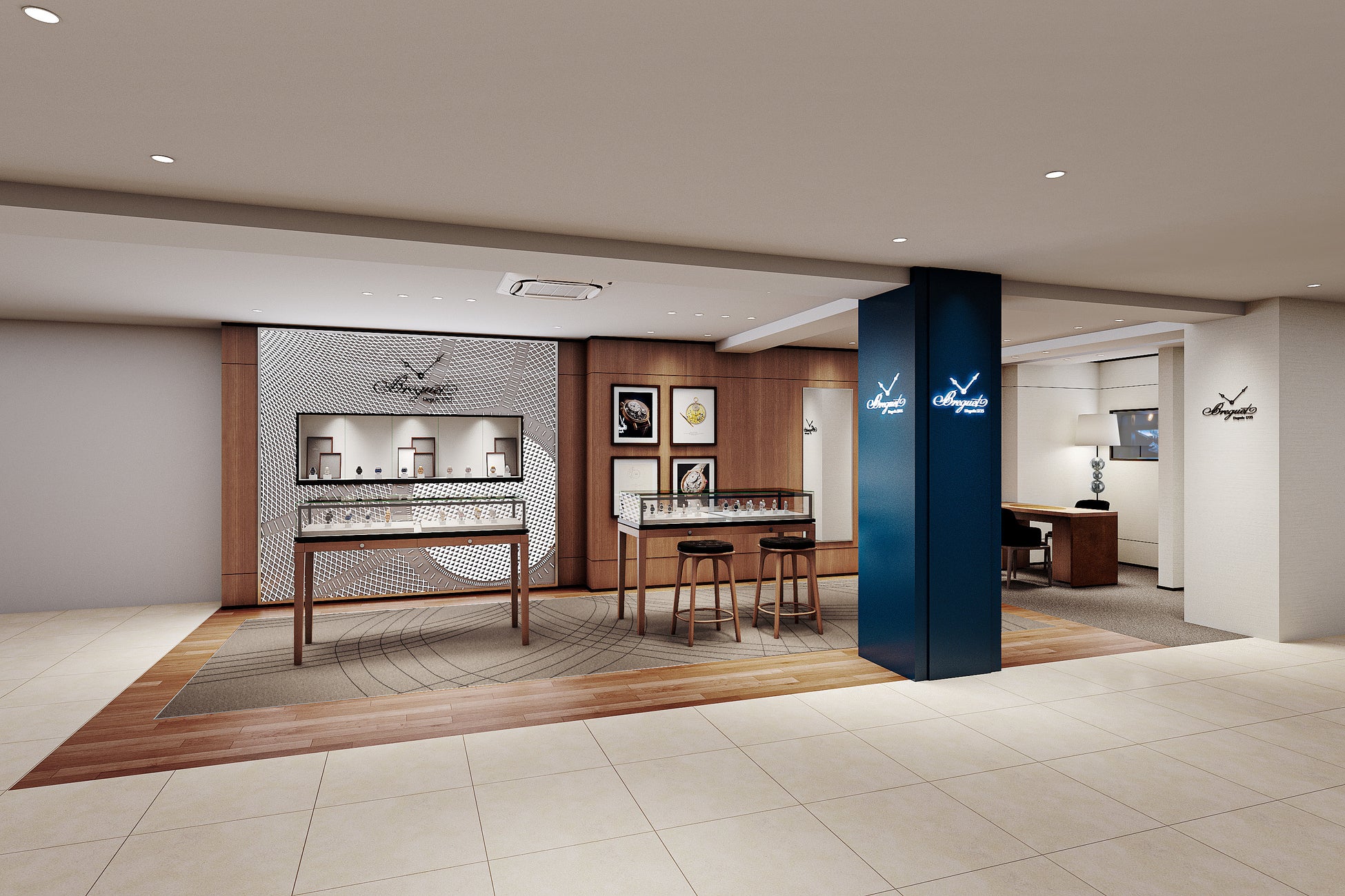 今回リニューアルとなるブレゲコーナーは、気品ある白と木目の組み合わせを基調とした壁に、ブレゲ針を彷彿させるブルーの柱がアクセントとなった、端正なレイアウトとなっております。特に目を引く壁面の装飾は、文字盤に施されている繊細なギョーシェ彫りの模様がモチーフとなっており、細部にわたってブレゲの歴史と世界観が表現されたコーナーとなっております。