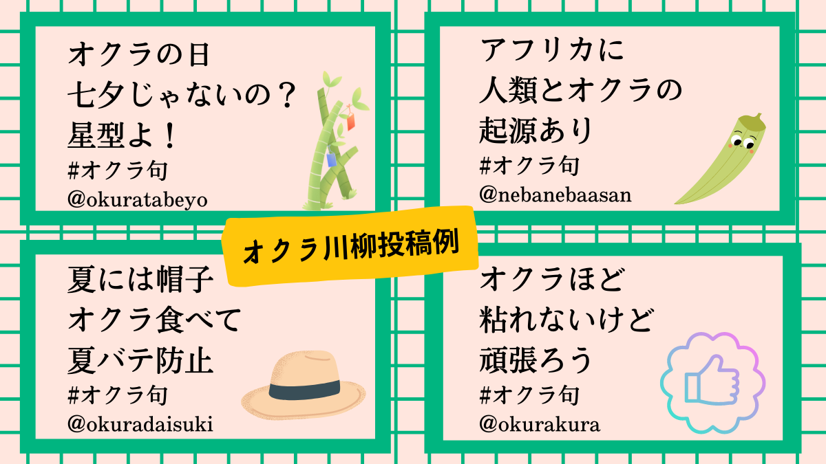 Twitterにてハッシュタグ「#オクラ句(“#”記号は半角のみ有効です)」をつけて川柳をツイートするだけで応募完了です。