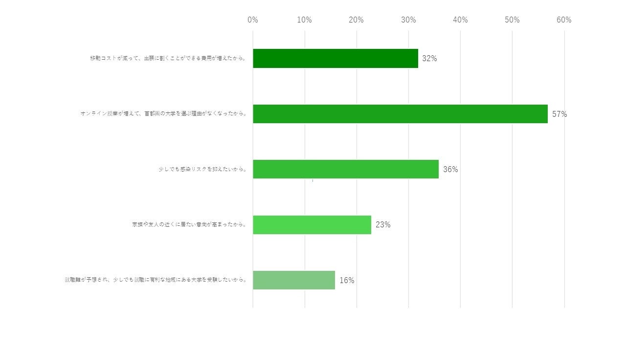 「受験を検討している地域が増えた理由を教えてください。」という問いについて、もっとも多かった回答が「オンライン授業が増えて、首都圏の大学を選ぶ理由がなくなったから。」そのあと、「少しでも感染リスクを抑えたいから。」「移動コストが減って、出願に割くことができる費用が増えたから。」「家族や友人の近くに居たい意向が高まったから。」と続く。