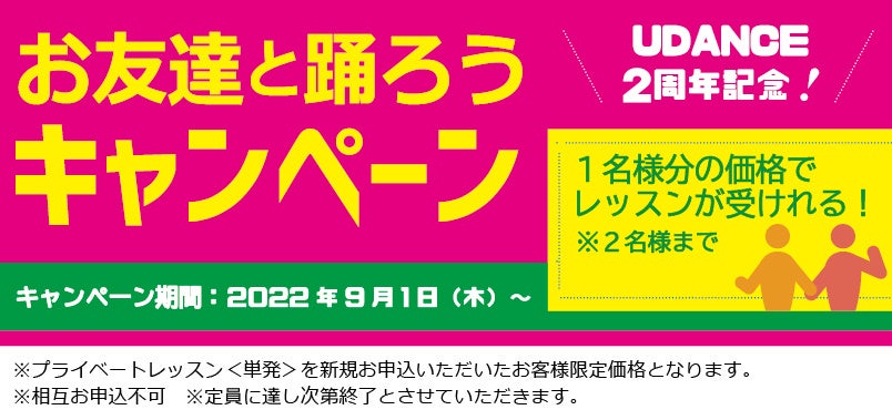 株式会社Uland(ウーランド、本社:神奈川県横浜市 代表取締役:ユウキ)が運営する、ダンス指導・振付『Udance』は、2周年を記念したお得なキャンペーン第2弾を開催いたしますのでお知らせいたします。