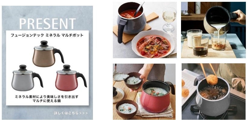 応募いただいた方の中から抽選で6名様(各色2名様)に、「フュージョンテック ミネラル マルチポット」をプレゼントいたします。