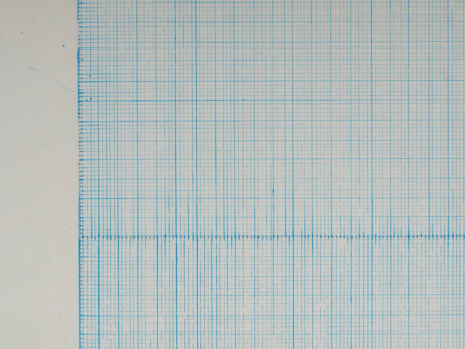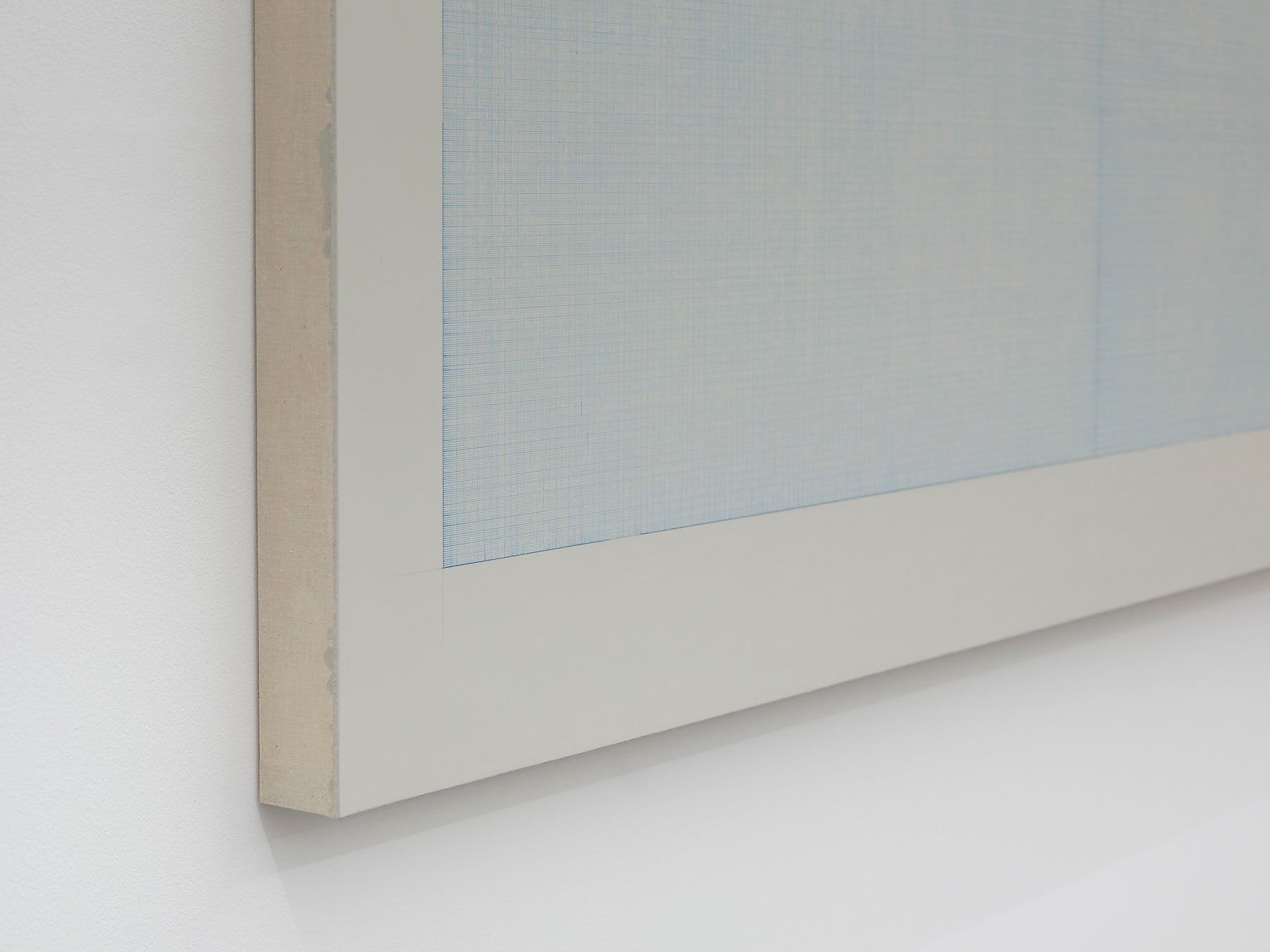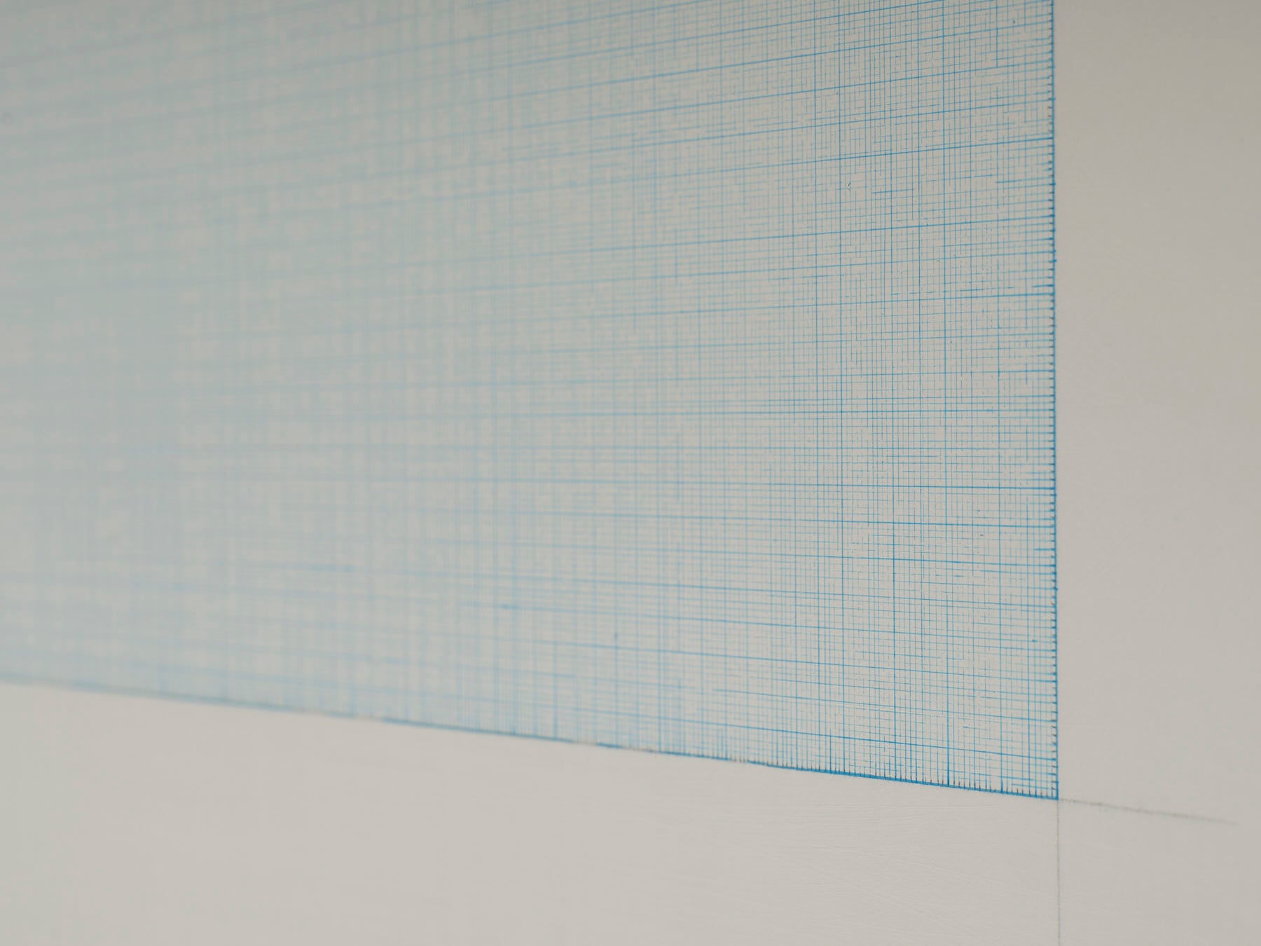 「何も描かないで絵画を成立させる」ということを考え続けてきた井上の絵画は、作品ごとに決まった法則を持つ「直線を描く」という単純な反復行為の集積によってイメージとなって立ち現れます。そのイメージは一見すると図やグラフなどを描くための方眼紙のようでもあります。