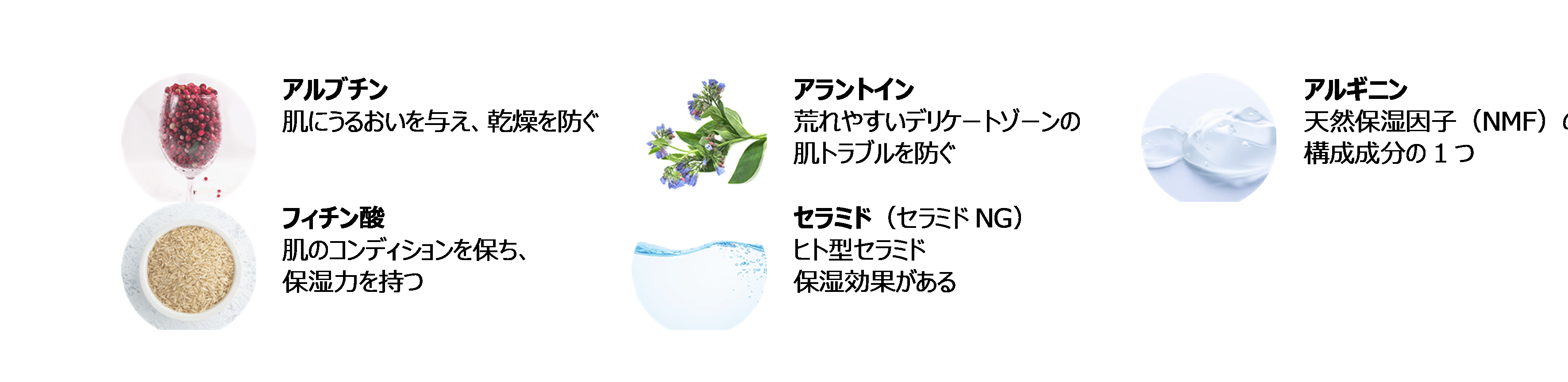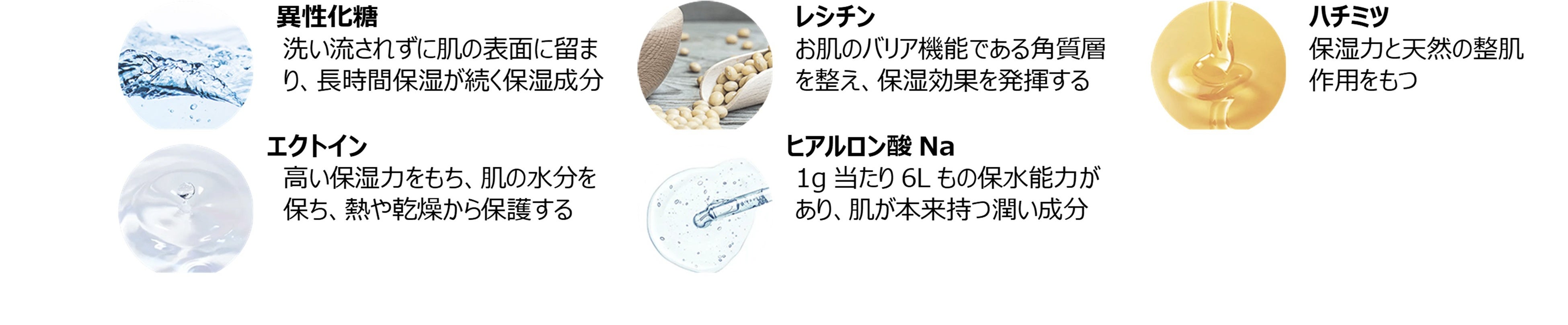 5種の高保湿うるおい保持成分「異性化糖」「エクトイン」「ヒアルロン酸Na」「レシチン」「ハチミツ」を配合し、洗い流した後もうるおいが続きます。