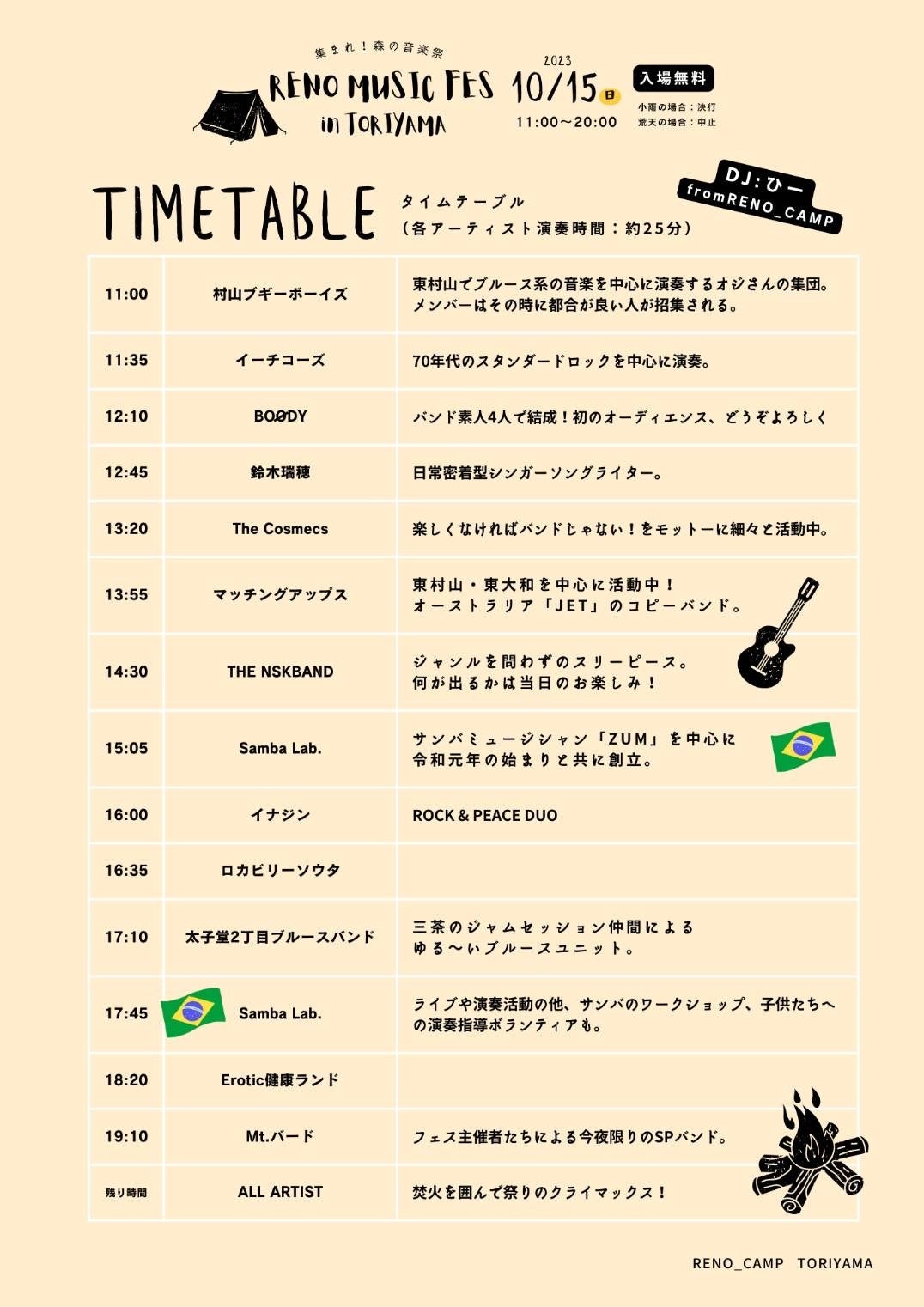11:00~ 村山ブギ―ボーイズ、イーチコーズ、BOODY、鈴木瑞穂、The Cosmecs、マッチングアップス、THE NSKBAND、Samba Lab.、イナジン、ロカビリーソウタ、太子堂2丁目ブルースバンド、Erotic健康ランド、Mt.バード、(出演予定のアーティスト)13組のアーティストによる生演奏を、食事やお酒などを楽しみながらお聴きいただけます。