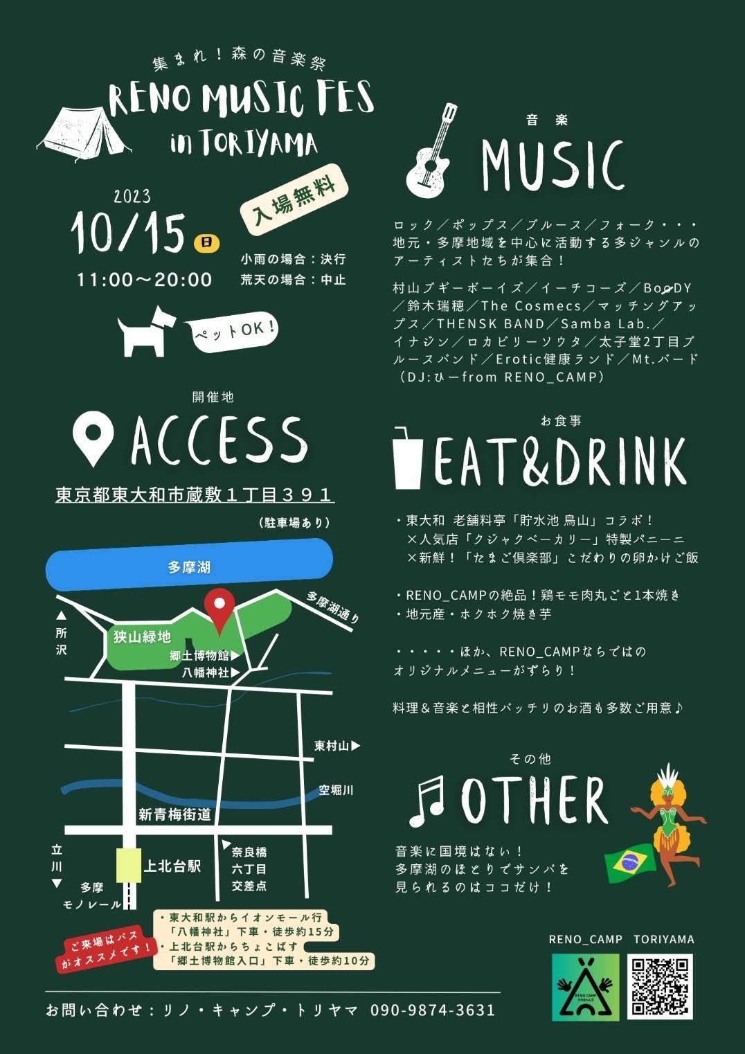 RENO CAMP TORIAMA(リノキャンプ鳥山)は、東京都東大和市にある通常、完全予約制のキャンプ体験施設です。テント利用、バーベキューキャンプ飯、焚火…準備から片付けまで全てスタッフが行いますので、お客様は手ぶらで、気軽にキャンプ体験ができます。ファミリー、子連れ、カップル、幅広い年齢層のお客様にお越しいただいております。