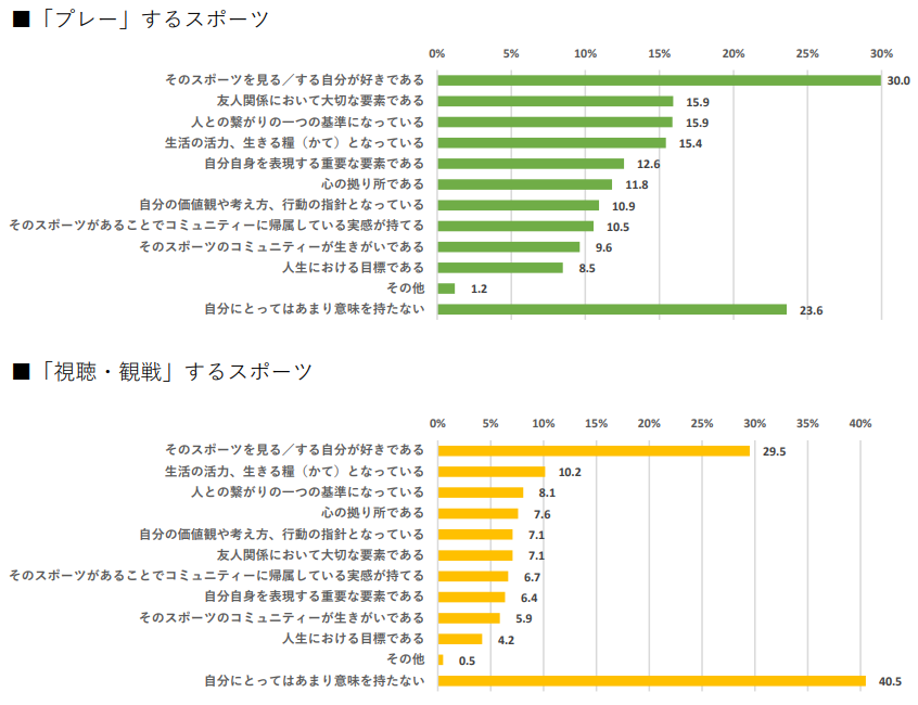 「プレー」「視聴・観戦」するスポーツが自身にとってはあまり意味がないという回答が一定数あったものの、意味をもたらす要素として共にトップに挙がったのが「そのスポーツを見る/する自分が好きである」という自己肯定感を高める要素であった(「プレー」するスポーツ:30.0%、「視聴・観戦」するスポーツ:29.5%)。また、「プレー」するスポーツに関しては、「友人関係において大切な要素である」や「人とのつながりの一つの基準になっている」が15.9%で2番目に高く、「プレー」するスポーツが人との関係を構築するという重要な局面における価値観へも影響を及ぼすことが見受けられた。(本調査結果より)