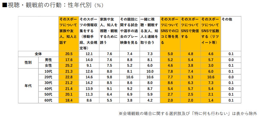 スポーツを「視聴・観戦」する前と後にする行動のトップは共に、「そのスポーツについて家族や友人、知人と話す」が20%を超え突出している(スポーツ前:20.5%、スポーツ後:22.6%)。年代別で見ても、全年代において同回答がトップで、若年層でさえSNSでの発信や拡散よりも、スポーツはコミュニケーションのネタとして話されていることが伺える。また性別では男性より女性の方が話す割合が高い(スポーツ前:男性17.6%、女性25.2%、スポーツ後:男性17.9%、女性30.0%)。(本調査結果より)