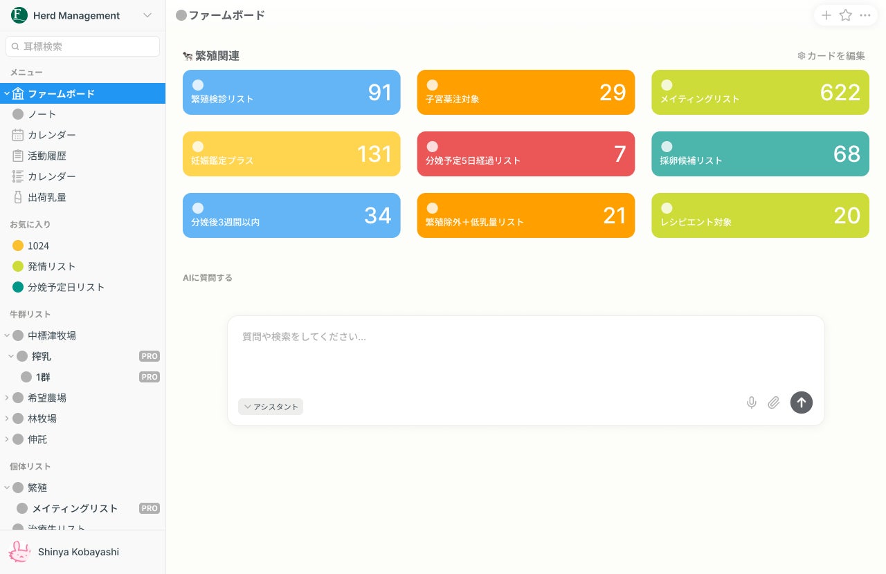 新しいプラットフォームでは、従来の牛群管理に留まらず、AIによる収益性シミュレーション、毎日の業務組み立てや実行支援を統合する次世代の酪農経営基盤であり、経営者の意思決定が翌日には現場スタッフのタスクとして自動的に変換されることで、牧場経営がサイクルし、生産者による「自律型牧場経営」を実現致します。