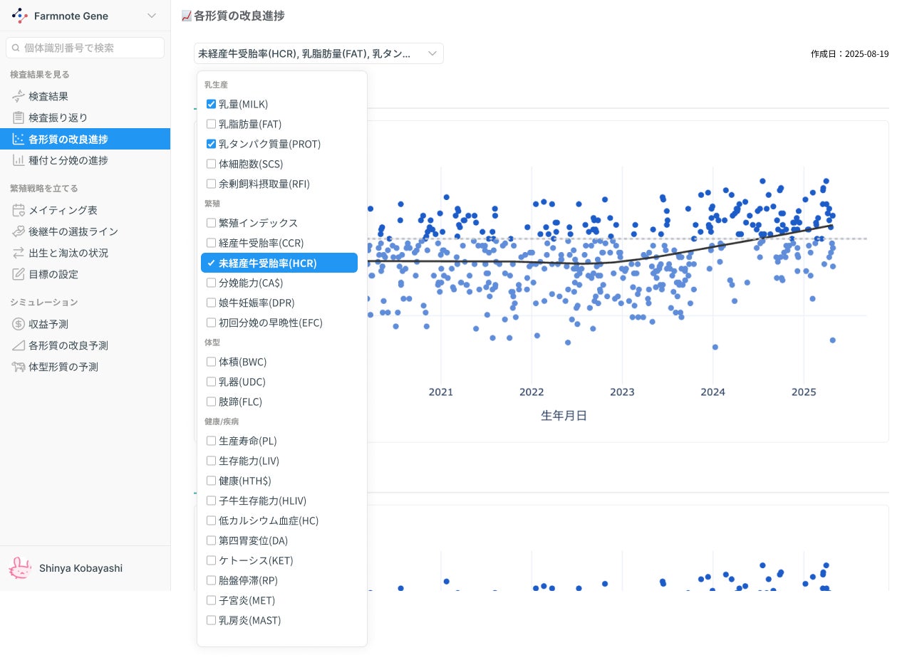 ゲノム検査データを元に、最も利益の出る運営シミュレーションの提示。育種改良進捗の確認、後継牛確保計画の自動策定、改良のベンチマークを行う。 |