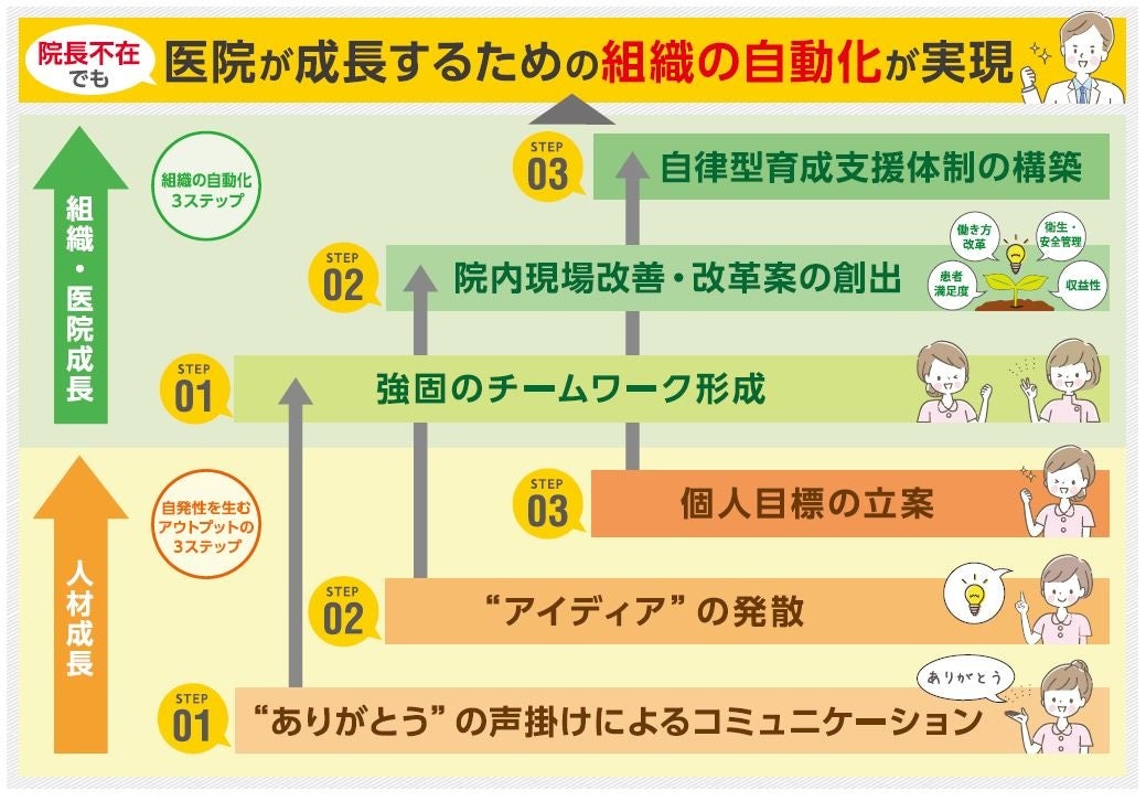 現場で日々起きる診療課題や医院の成長目標達成に向けたアイディアが院内に飛び交う文化を形成していきます。
