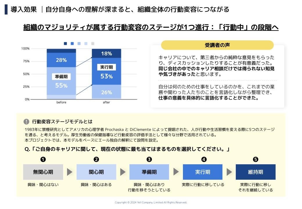 パナソニック コネクト株式会社では、2023年4月より風土改革の一環として、積極的な人事制度改革を行い、約12,000人の国内全社員を対象とした「ジョブ型人材マネジメント」を一斉導入。施策の一つとして、社外人材による1on1プログラム「YeLL キャリトレ(現「YeLL キャリトーク」*)」を実施しました。終了後のアンケートの結果、行動変容に関する質問で、「興味関心はあるが行動に至っていない」と回答した社員が55%から26%へと減少し、「実際に行動している」と回答した社員が28%から53%へと大幅に上昇しました。
