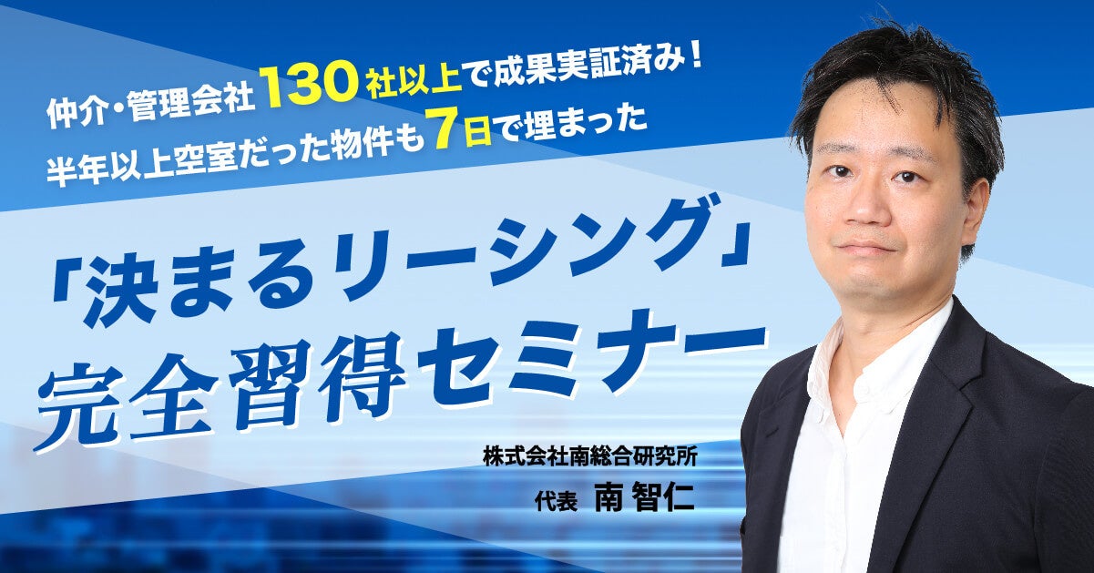 リーシングで小さな1店舗を16店舗・従業員数100名以上に成長させた賃貸仲介・管理のプロフェッショナル、株式会社南総合研究所代表の南智仁が「長期空室でも決まるリーシング力」を、特別に今回オンラインセミナーを通してお伝えします。