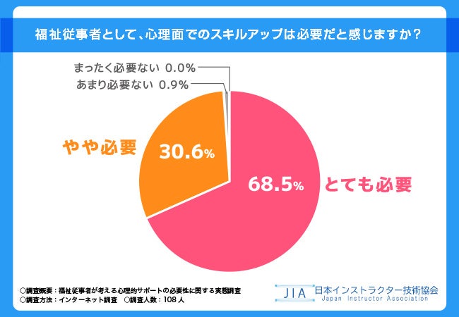 また「やや必要」と回答した方は30.6%で、これを合わせて全体の99.1%が心理面でのスキルアップが必要と感じていることが明らかです。