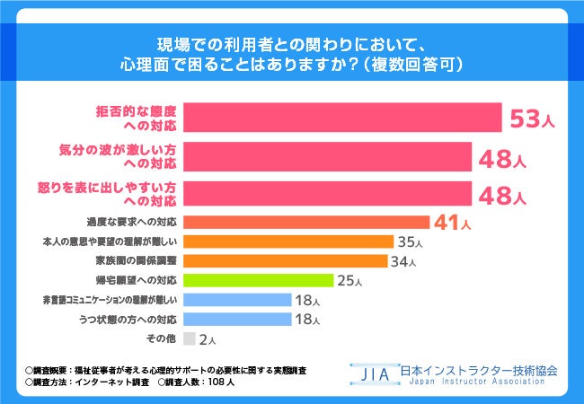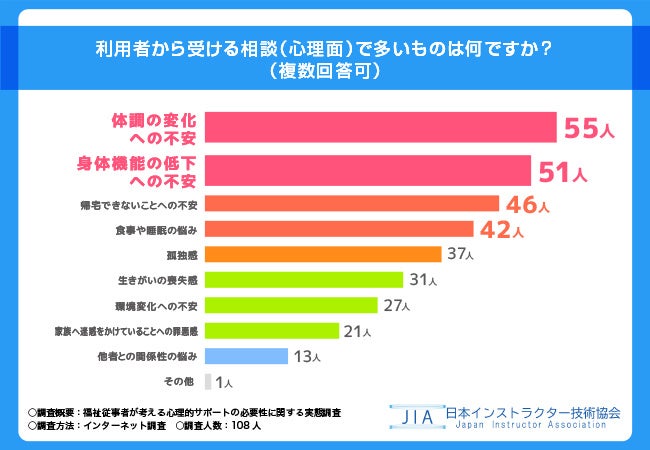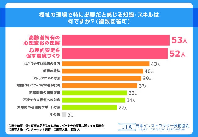 日本インストラクター技術協会(本社所在地:東京都千代田区)は、高齢者に関わる福祉に従事している全国20〜60代の男女108名を対象に「福祉従事者が考える心理的サポートの必要性」に関する実態調査を実施しました。