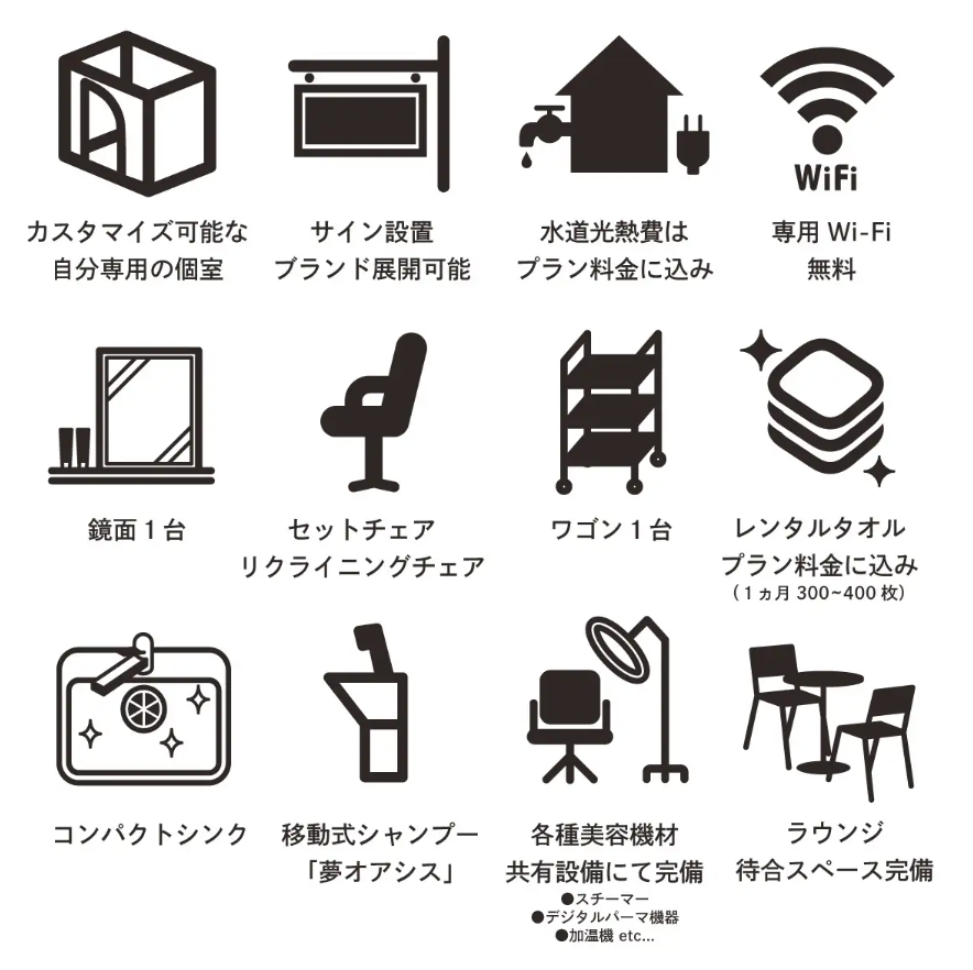 個人で専有できる完全個室空間を利用し『独立したフリーランス美容師のブランド化(独自のサロンブランド)』をあらゆる形で支援し、施設の提供だけではなく、ライフスタイルや働き方の変化等、多様性の拡大を想定した「ニューノーマル時代の顧客体験」をご提供中です。