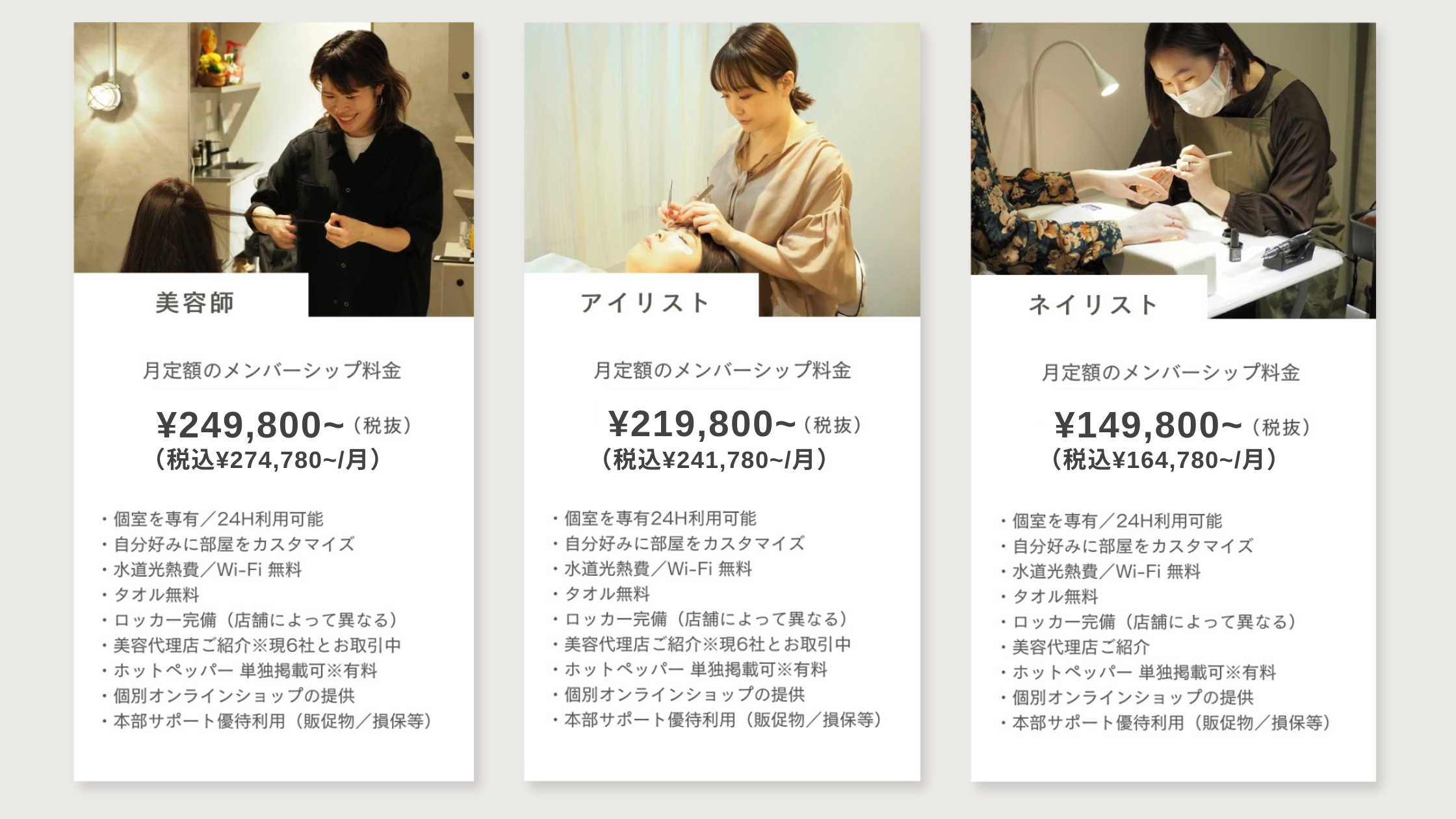 ・月額専有個室プラン(美容師) ¥249,800〜 ※個室のスペックにより金額が異なります。