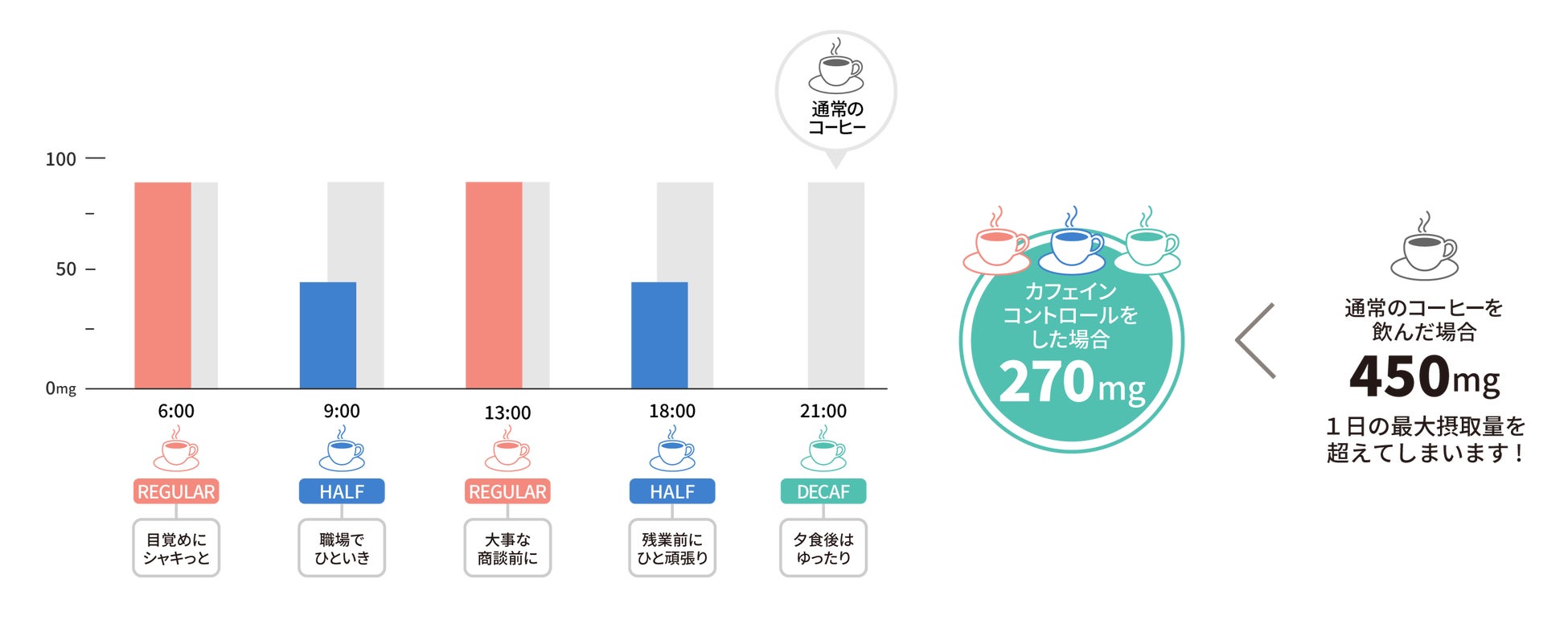 例えば、朝は「レギュラー」、3杯目からは「ハーフ&ハーフ」、夜は「デカフェ」など、時間帯や体調に合わせてカフェインの量を選び、日中の活気と良質な睡眠をサポートいたします。
