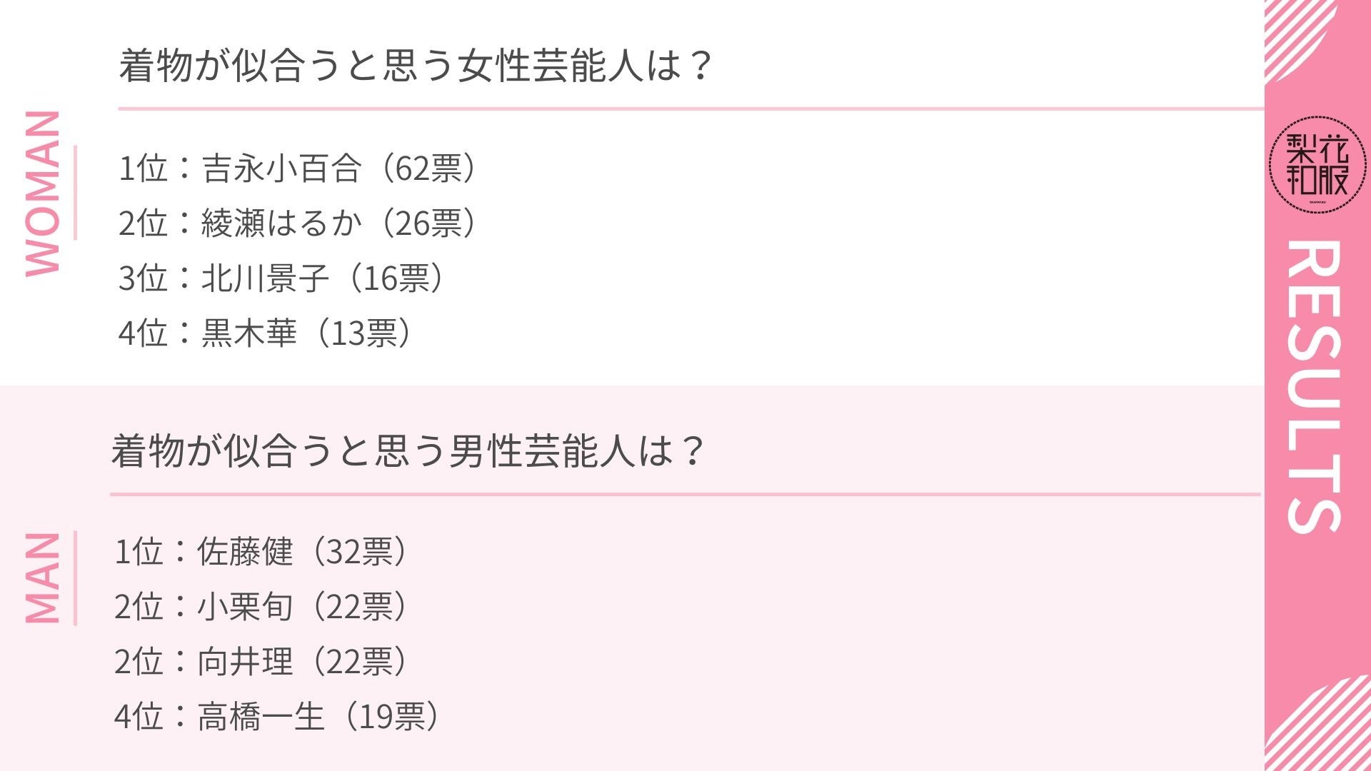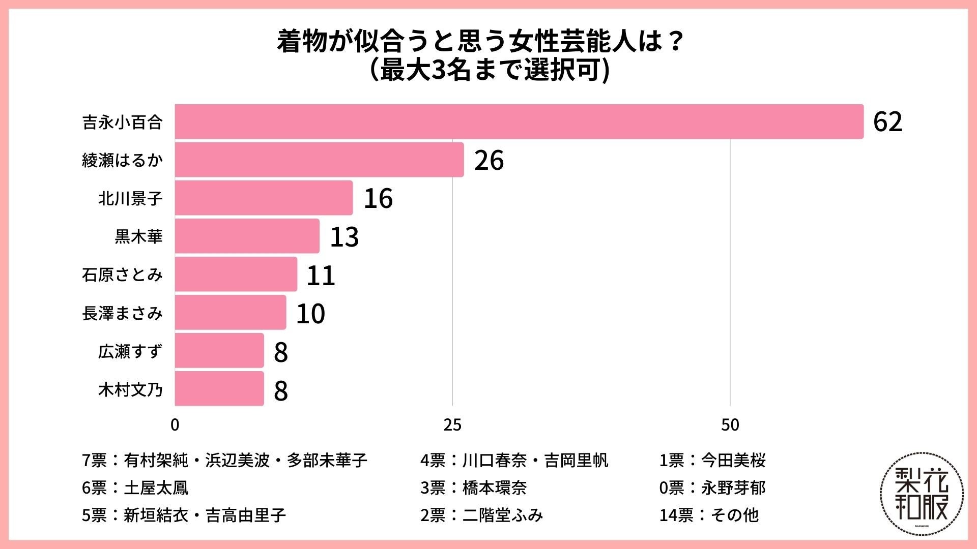 着物が似合うと思う女性芸能人、1位は吉永小百合さん(62票)、2位は綾瀬はるかさん(26票)、3位は北川景子さん(16票)、4位は黒木華さん(13票)となりました。