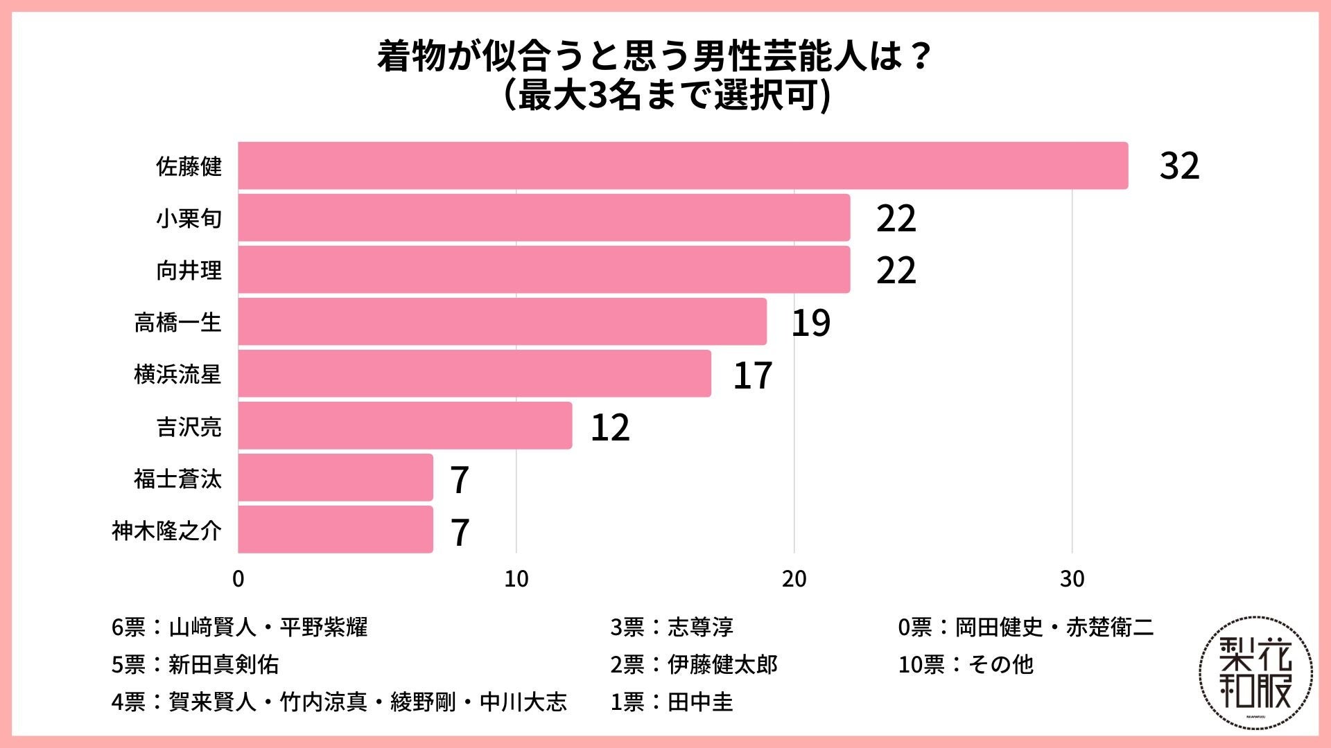 着物が似合うと思う男性芸能人、1位は佐藤健さん(32票)、2位は同率で小栗旬さん、向井理さん(22票)、4位は高橋一生さん(19票)となりました。
