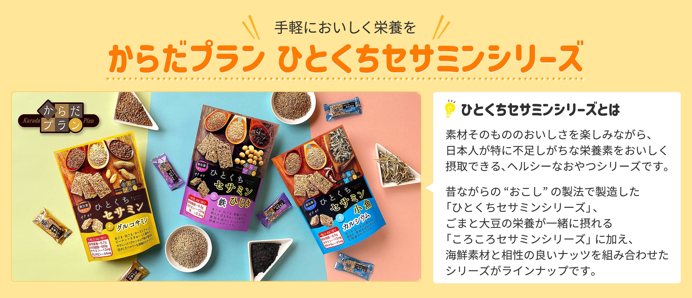人気のナッツスナッキングシリーズ、POP!グルメポップコーンシリーズ、からだプラン ひとくちセサミンシリーズ、など、盛りだくさんのラインナップです。今後、通販サイト限定の商品も続々登場いたします。