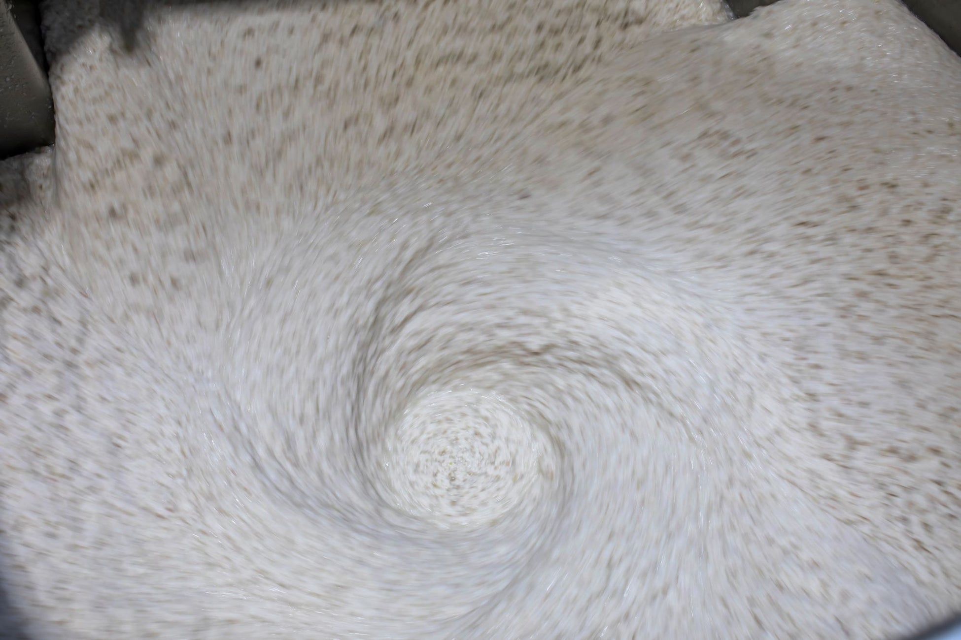 その繊維は水を加えて洗い、ゴミなどを除いたら、まんべんなく広げてシート状に。水分を絞り、6台の大きなローラー状のアイロンの間を通しながら熱で乾かします。