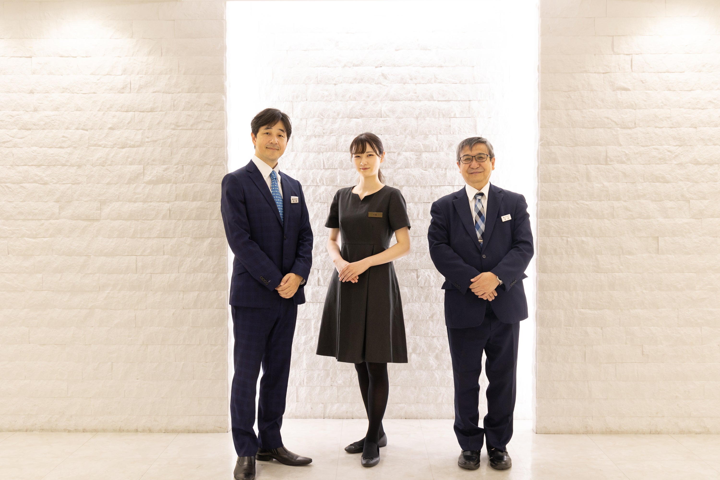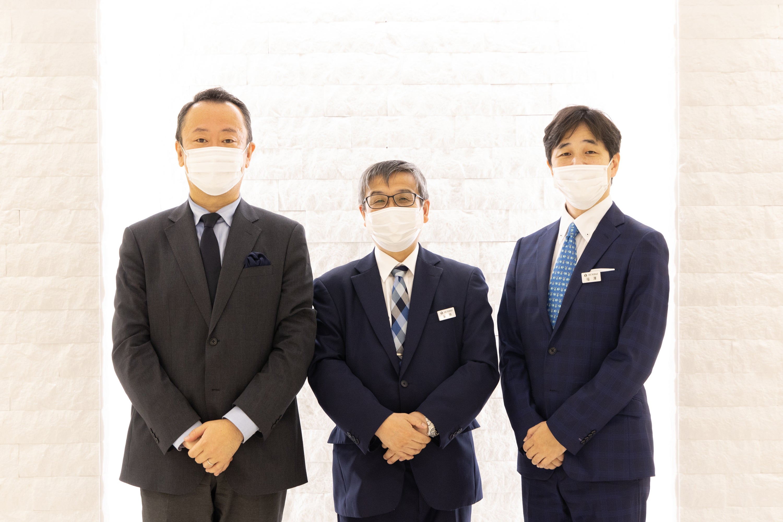 左から大堀社員(学校OG)、鈴木代表取締役、駿台トラベル&ホテル専門学校 塚原校長、同 福澤ブライダル学科長