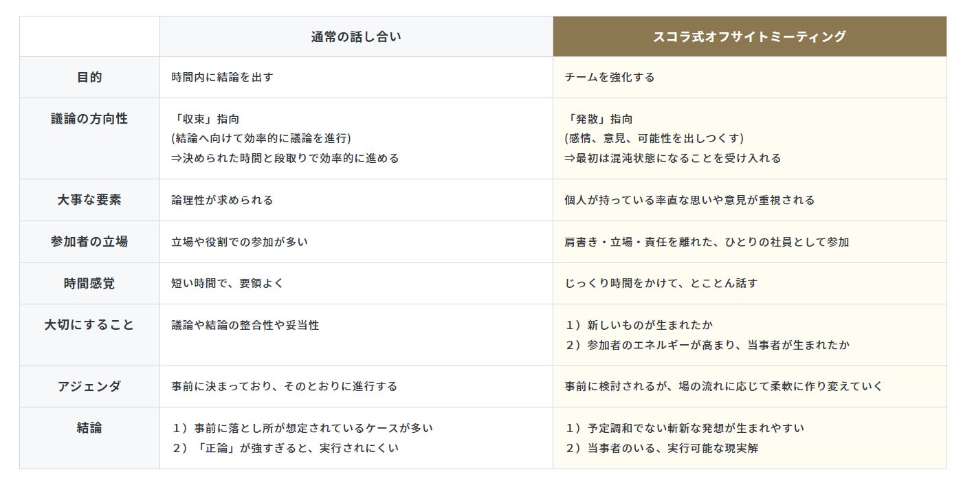 一方、当社が推奨するスコラ式オフサイトミーティングでは、「チームを強化する」「肩書き・立場・責任を離れた、ひとりの社員として参加」「じっくり時間をかけて、とことん話す」等、“安心して話し合える状態”を創り出すことを最優先しています。