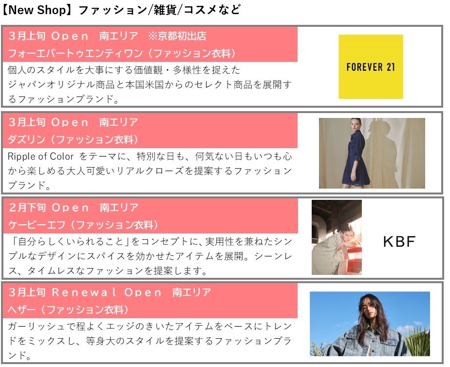 南エリアでは、Z世代に人気の店舗が続々オープンします。ファッション衣料では、日本再上陸を果たしたFOREVER 21が京都初出店。約60坪の店内に、本国米国・日本オリジナルの厳選された商品を展開します。また、心はずむ可愛いファッションを提案するダズリン、可愛らしさと女性らしさを叶えるランジェリーブランドのリサマリ、シンプルなデザインとミニマルで実用性を兼ねたスタイルを提案するケービーエフが新規出店します。その他にも、西エリアでZ世代のお客様からの支持が厚いヘザーが南エリアに移転します。