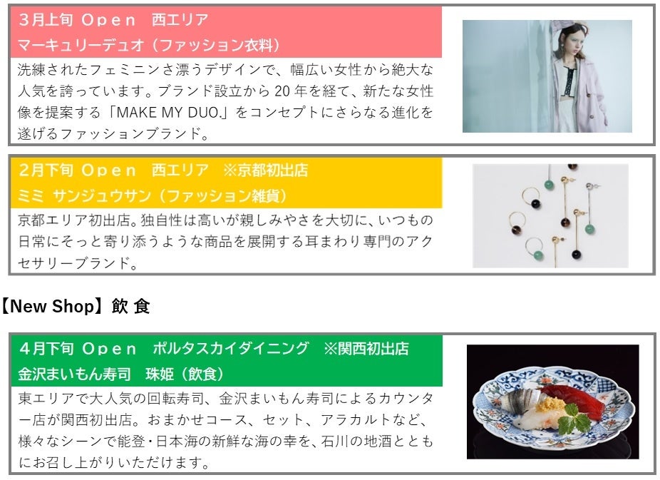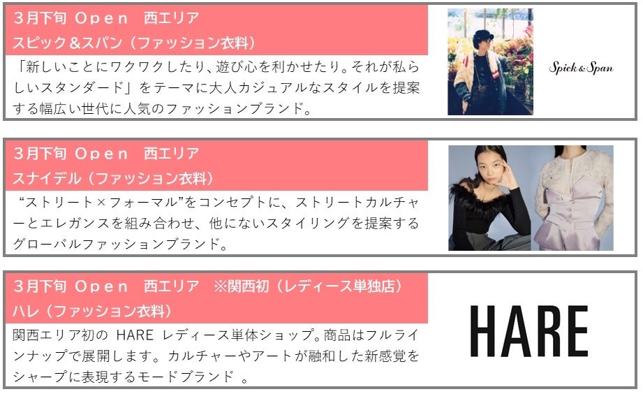 西エリアでは、ミレニアル世代に向けたレディースファッションの強化として、大人カジュアルなスタイルを提案するスピック&スパン、ストリートカルチャーとエレガンスを組み合わせ、他にないスタイリングを提案するスナイデル、洗練されたフェミニンさ漂うデザインを提案するマーキュリーデュオ、関西初のレディース単独店となるモードブランドハレが新規出店。アクセサリーでは、女性らしさを大切にした耳まわり専門のアクセサリーブランドミミ サンジュウサンが京都初出店します。