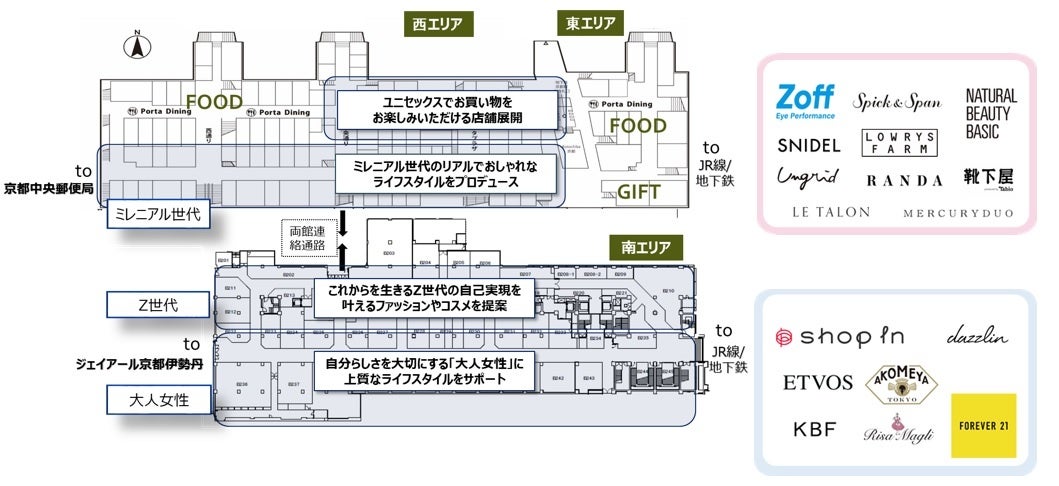 そこで今回は、エリアごとの立地特性を踏まえながら、通勤通学で京都駅を日々利用されるZ世代の女性や隣接するジェイアール京都伊勢丹をご利用の「大人女性」、さらには男性のご利用も想定したユニセックスでご利用いただける店舗などを拡充し、より幅広い層のお客様にお楽しみいただける施設とします。