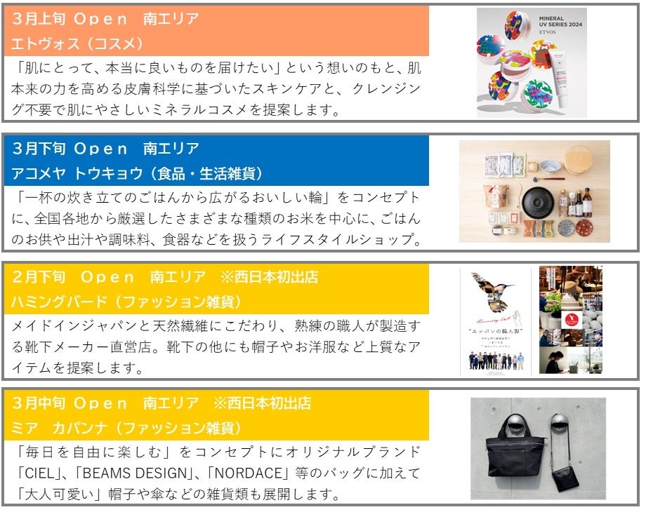 ショップについては、2024年2月から5月にかけて順次開業します。開業日の詳細は改めてお知らせします。南エリアの新たな館内環境については、2024年3月1日使用開始の予定です。