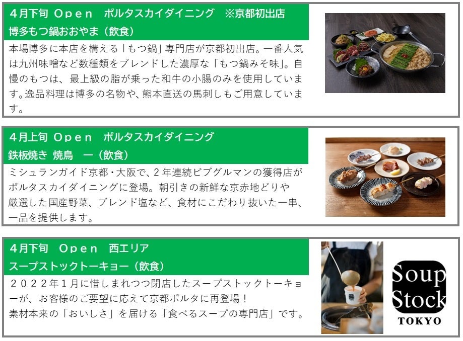 第1弾として、各店の概要や館内環境リニューアルについてお知らせします。物販店は概ね3月に、飲食店は4月以降の開業を予定。具体的な開業日、合わせて実施するプロモーションの概要等については改めて2月中旬頃にお知らせします。さらにバージョンアップする京都ポルタにご期待下さい。