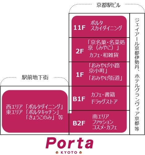 ポルタスカイダイニング(京都駅ビル11F/旧ザ・キューブ)、南エリア、 西エリア、東エリア(京都駅前地下街/旧ポルタ)