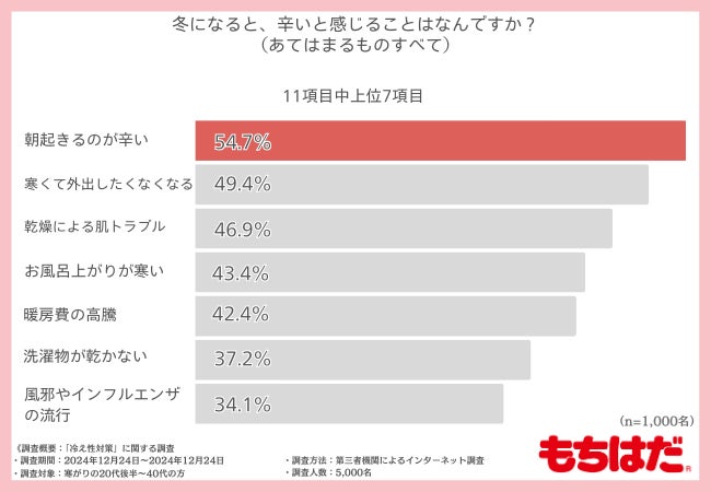 寒がりの方を対象に、『冬になると、辛いと感じることはなんですか?(あてはまるものすべて)』と質問したところ、「朝起きるのが辛い(54.7%)」と半数以上で一番多い回答でした。