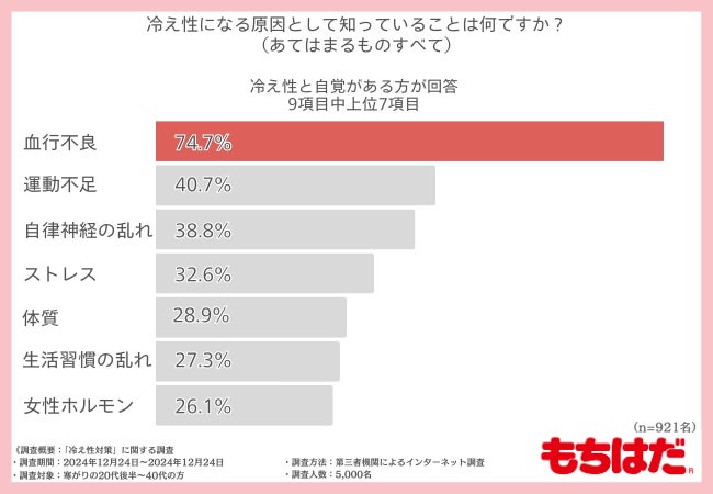 先にも触れたように、根本的な理由は血行不良であるとされていますが、今回の回答でも約4人に3人の方は「血行不良(74.7%)」と回答しています。