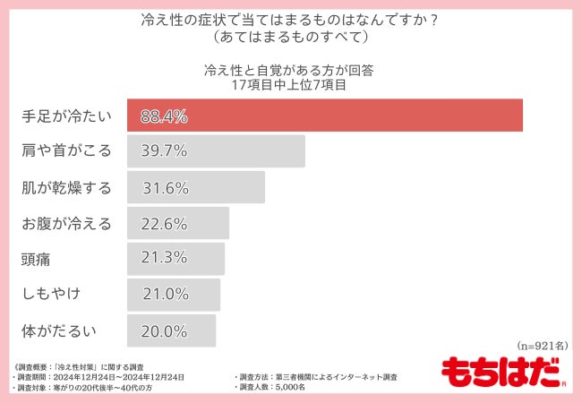 それ以降は「肩や首がこる(39.7%)」「肌が乾燥する(31.6%)」「お腹が冷える(22.6%)」「頭痛(21.3%)」「しもやけ(21.0%)」と続きました。