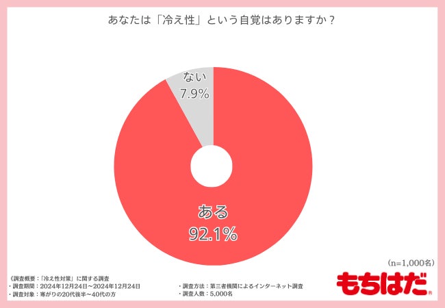 自覚があると回答した方は、92.1%と9割以上の方が寒がりであり、冷え性であると自覚していることがわかりました。